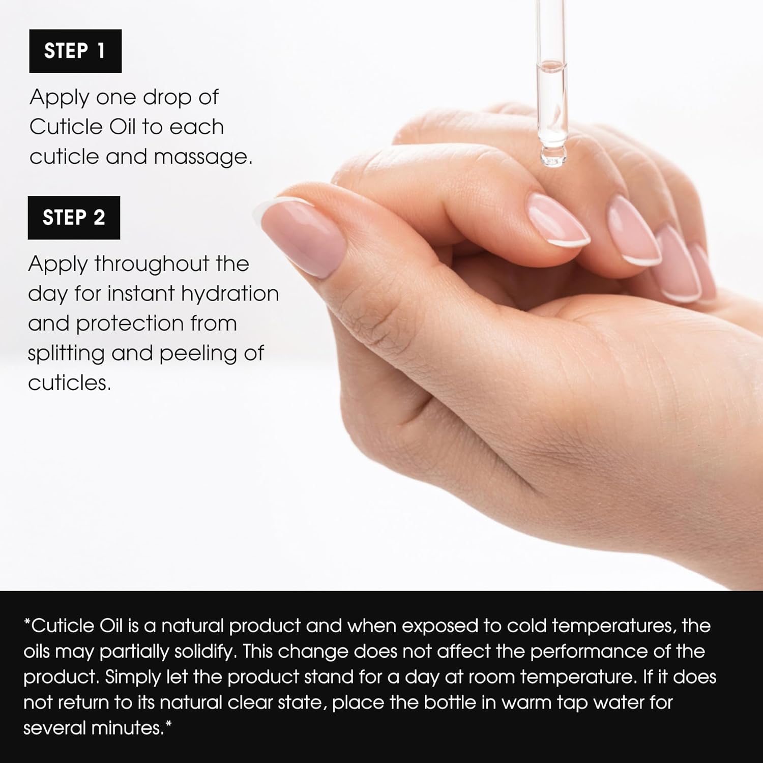 - EASY TO USE: Apply one drop of Cuticle Oil to each cuticle and massage. Apply throughout the day for instant hydration and protection from splitting and peeling of cuticles.