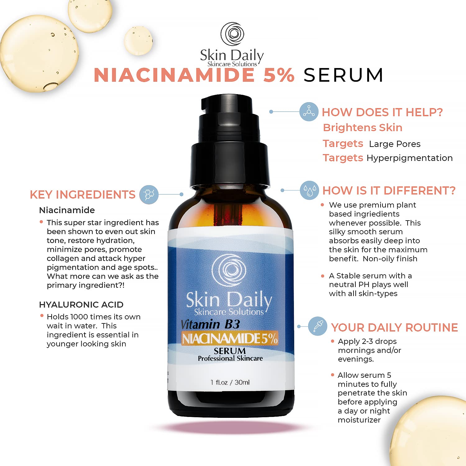 SkinDaily Niacinamide Serum for Face -1oz- Vitamin B3 Pore Minimizer Dermatologist Recommend Concentration - Targets Aging Skin, Wrinkles, Dark Spots - Superior Moisturizer and Skin Brightening