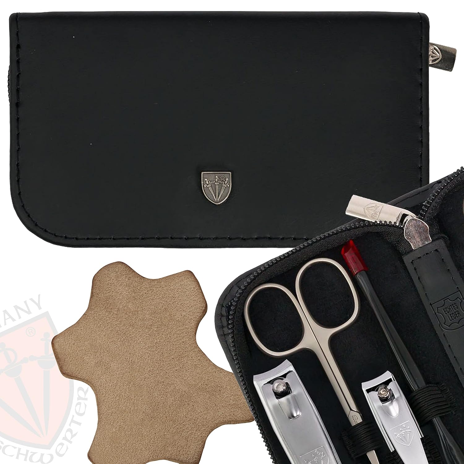 - CASE: Genuine leather black, size ca. 13,5 x 7,5 x 2,5 cm. Our organizers are made of high-grade fashion or classic materials. Additional equipment: Microfiber cleaning cloth for cleaning steel items, general info sheet “Finger - Nail Grooming”.