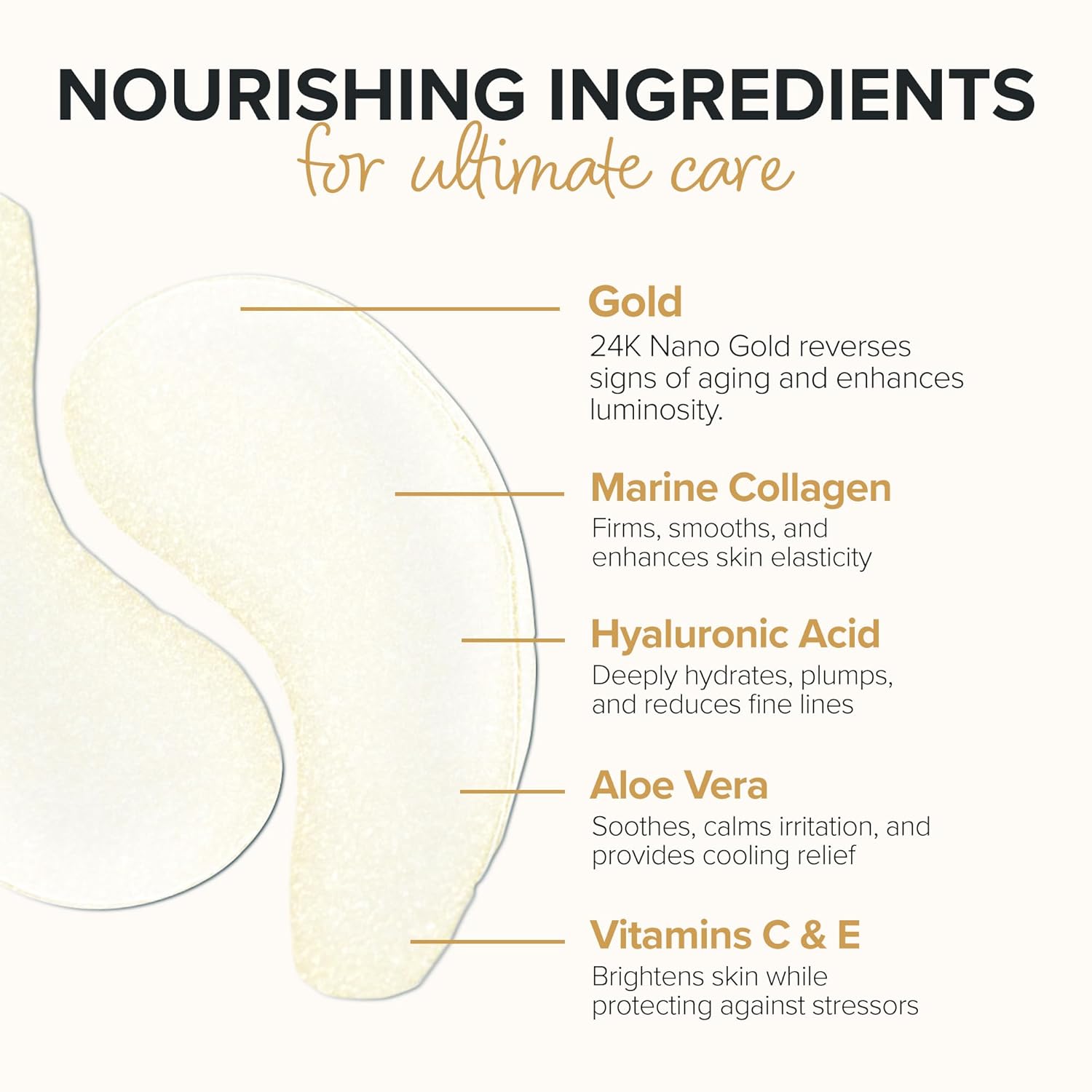 - NUTRIENT PACKED. EYES collagen gel masks are micro-infused with a combination of hyaluronic acid, natural high-density marine collagen, enzymes, amino acids, natural marine minerals, trace elements, proteins and vitamins C & E.