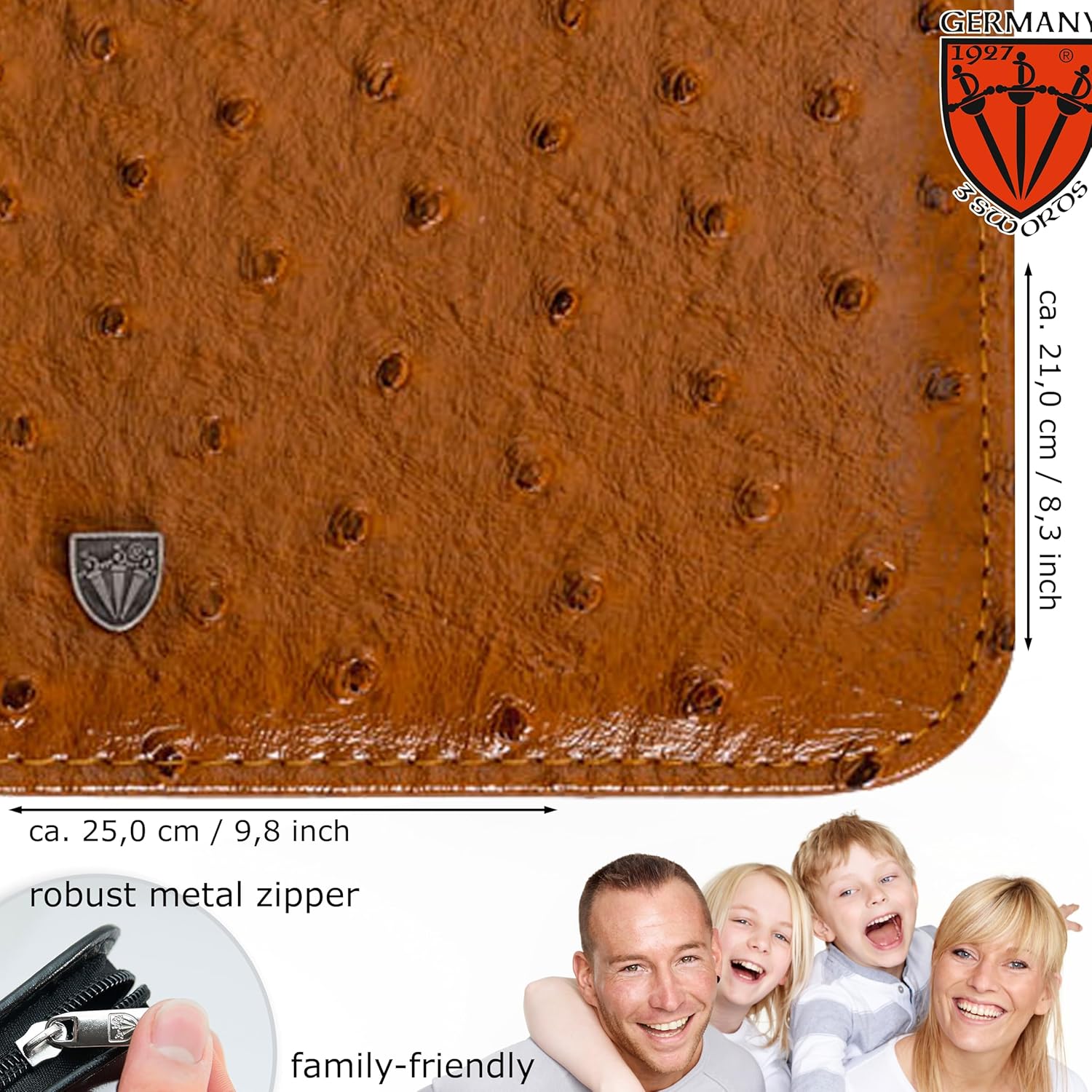 - CASE: Synthetic leather ostrich cognac, size ca. 25,5 x 21,0 x 3,0 cm. Our organizers are made of high-grade fashion or classic materials. Additional equipment: Microfiber cleaning cloth for cleaning steel items, general info sheet “Finger - Nail Grooming”.