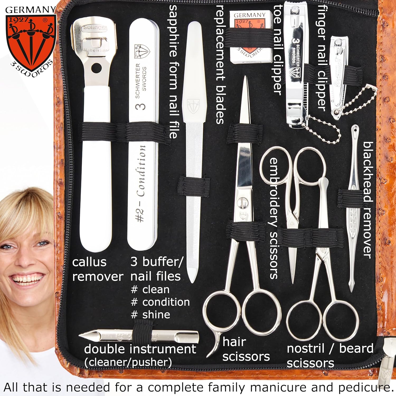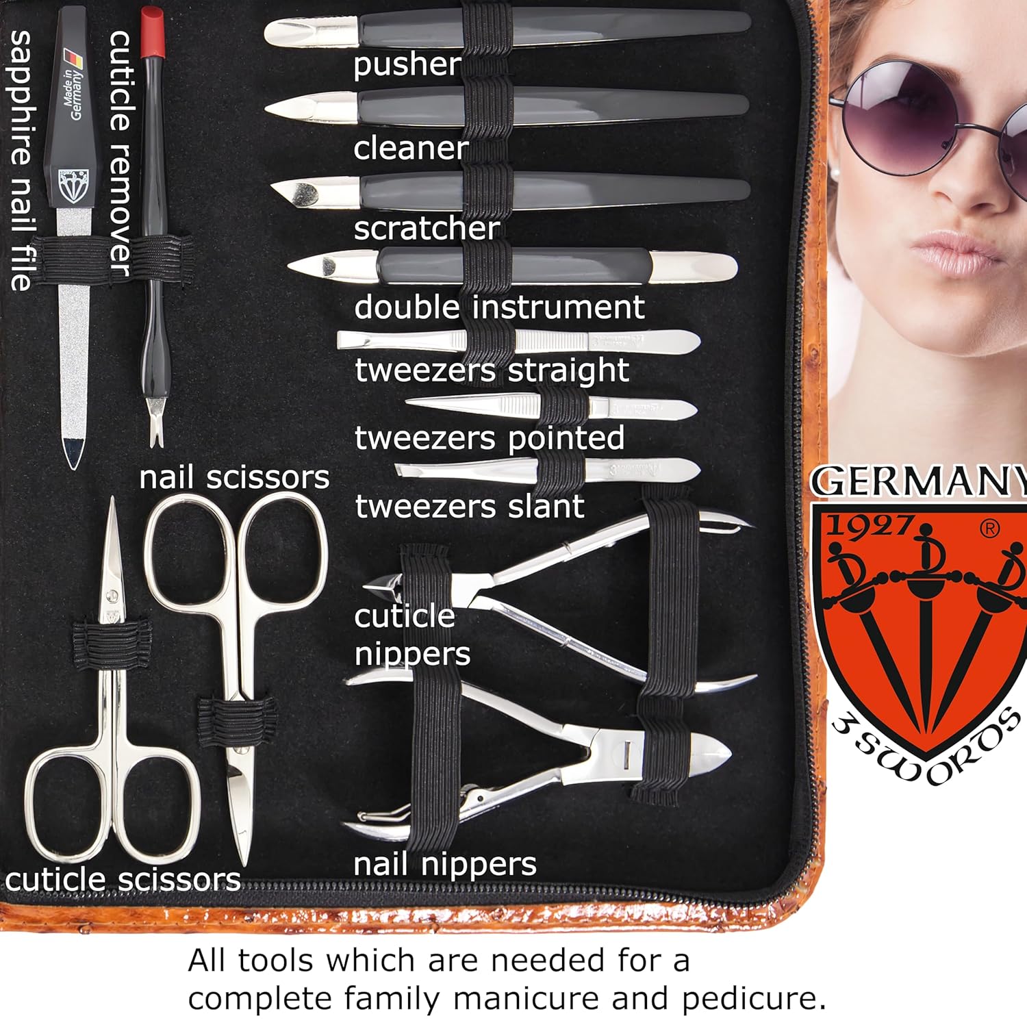 - CONTENTS: Cuticle scissors, nail scissors, cuticle nipper, nail nipper, tweezers oblique, tweezers pointed, tweezers straight, sapphire nail file, pusher/cleaner/scraper, double instrument, hoofstick, nail cleaner, blackhead remover, nail nipper, toe nail nipper, sapphire form file - curved blade, callus remover, corn rasp, hair scissors, nostril scissors, embroidery scissors.