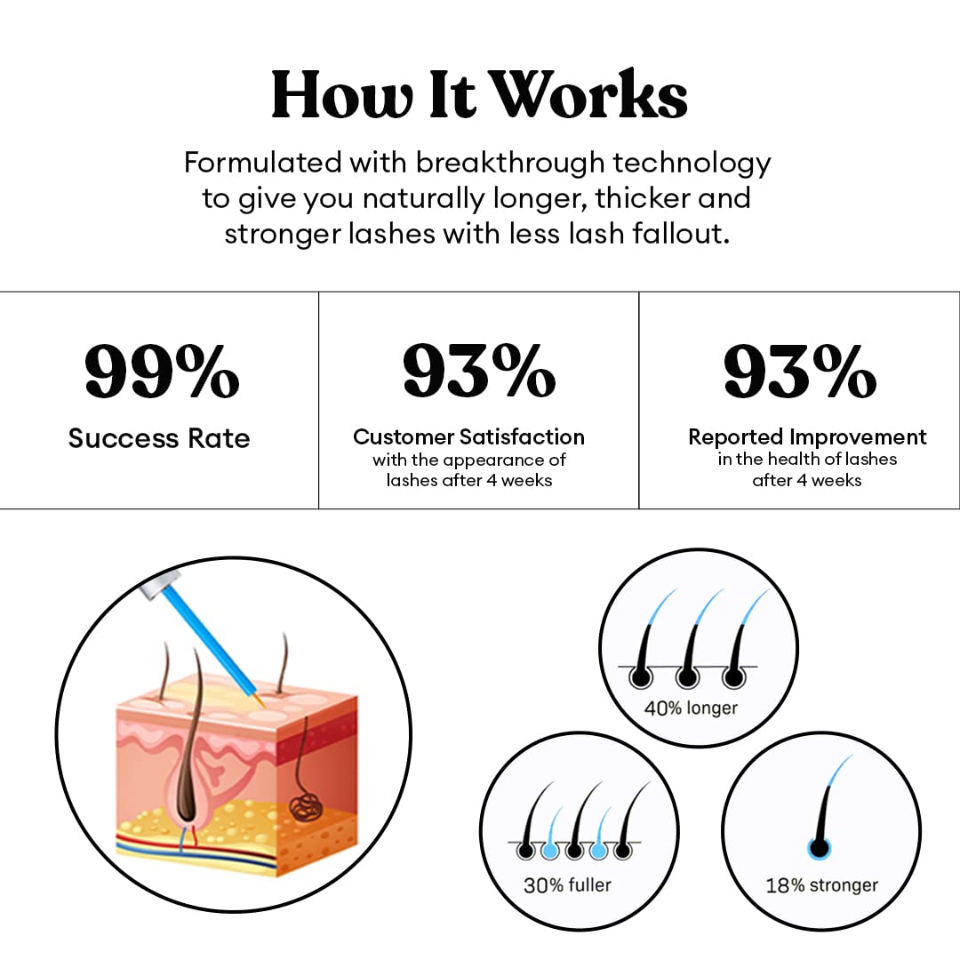 - Breakthrough Technology: It works by activating the hair follicle to promote rapid growth of eyelashes, making them grow longer, thicker, and fuller. This very same serum also toughens up the epidermal junction (where the lash grows out of the eyelid), helping prevent the newly grown eyelashes from falling out.