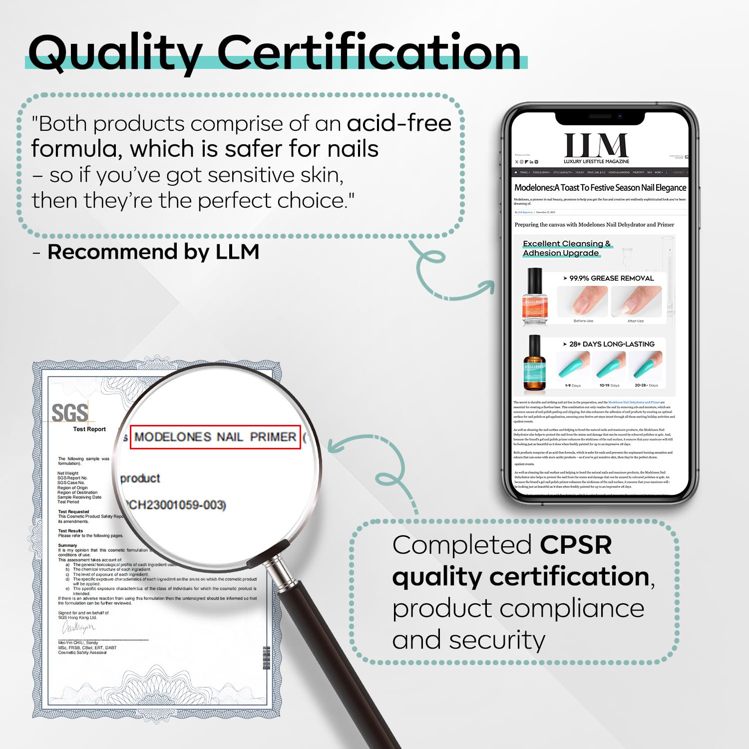- The basis and must-have of nail art: To create a foundation, using this nail prep kit to prepare the nail plate is the most crucial step in any professional manicure! The dehydrator nail prep can clean the nail surface and helps to bond the natural nails and mani products. The gel nail polish primer can enhance the stickiness of the nail surface, and help the mani products not lift and be long-lasting for more than 28 days.