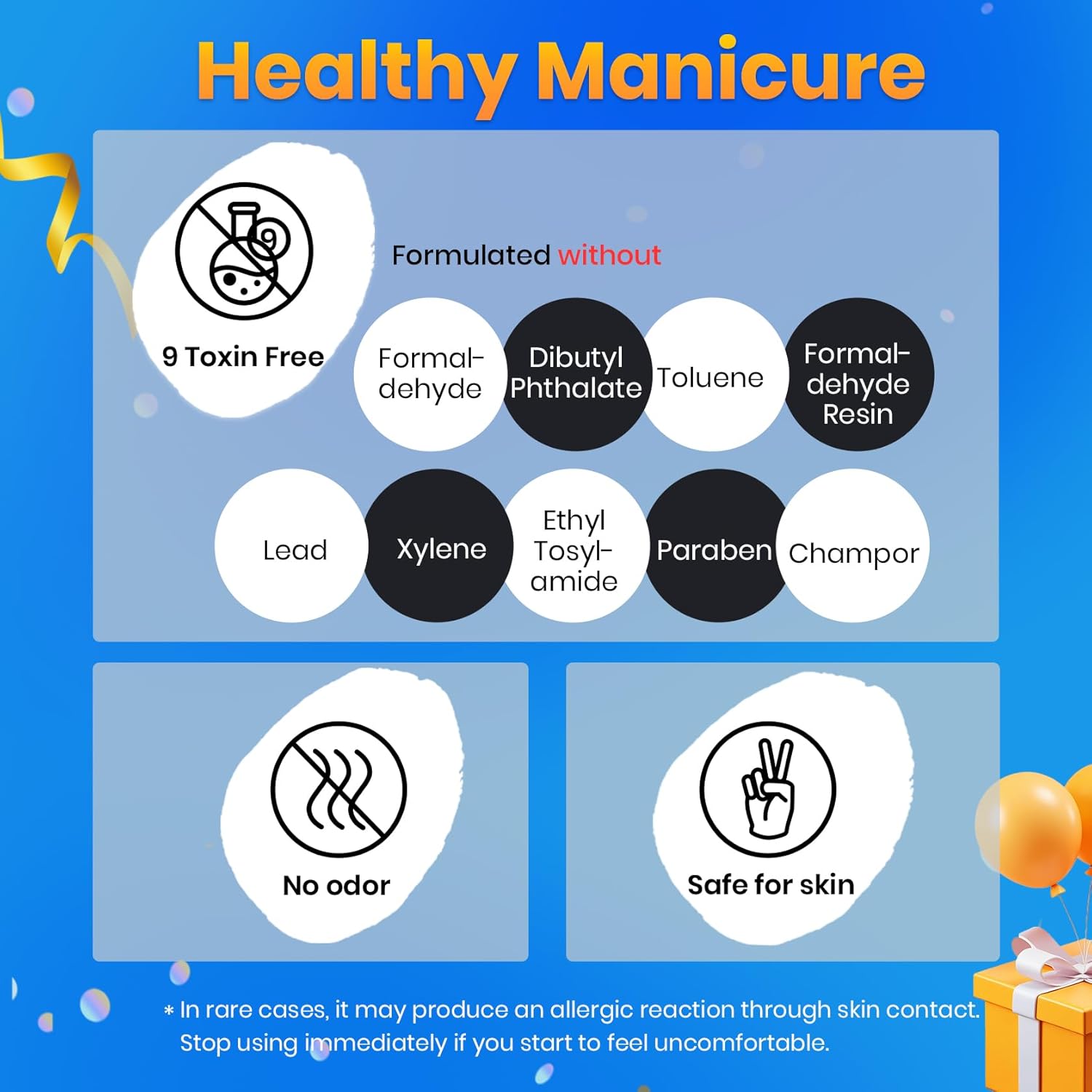- [Safety Elements] This product may cause an allergic reaction if it comes into contact with the skin. It is important to read the directions for use carefully and only apply the product to nails. Avoid contact with the eyes, mouth, and skin. In case of contact with these areas, rinse immediately with water and seek medical attention if necessary. Discontinue use of the product if redness and itching develop. Keep the product out of reach of children.
