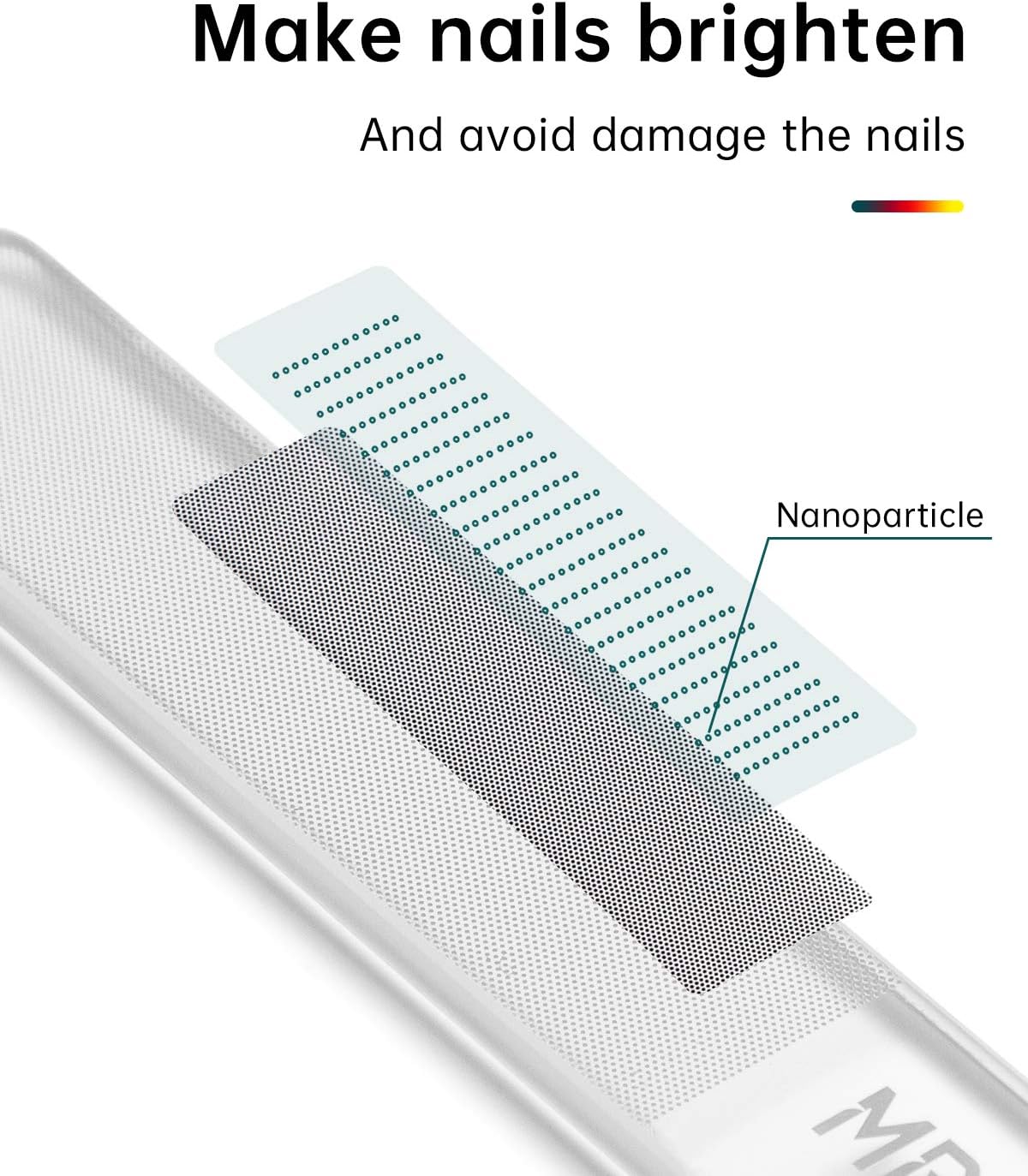 - The Healthiest Nano Nail Shiner: 2023 latest upgraded version of nail shine buffers, made of high-density nano glass, 30 seconds to a smooth glass-shine! No longer need clear polish, successfully get rid of damage to the surface of nails from inferior grit nail file.