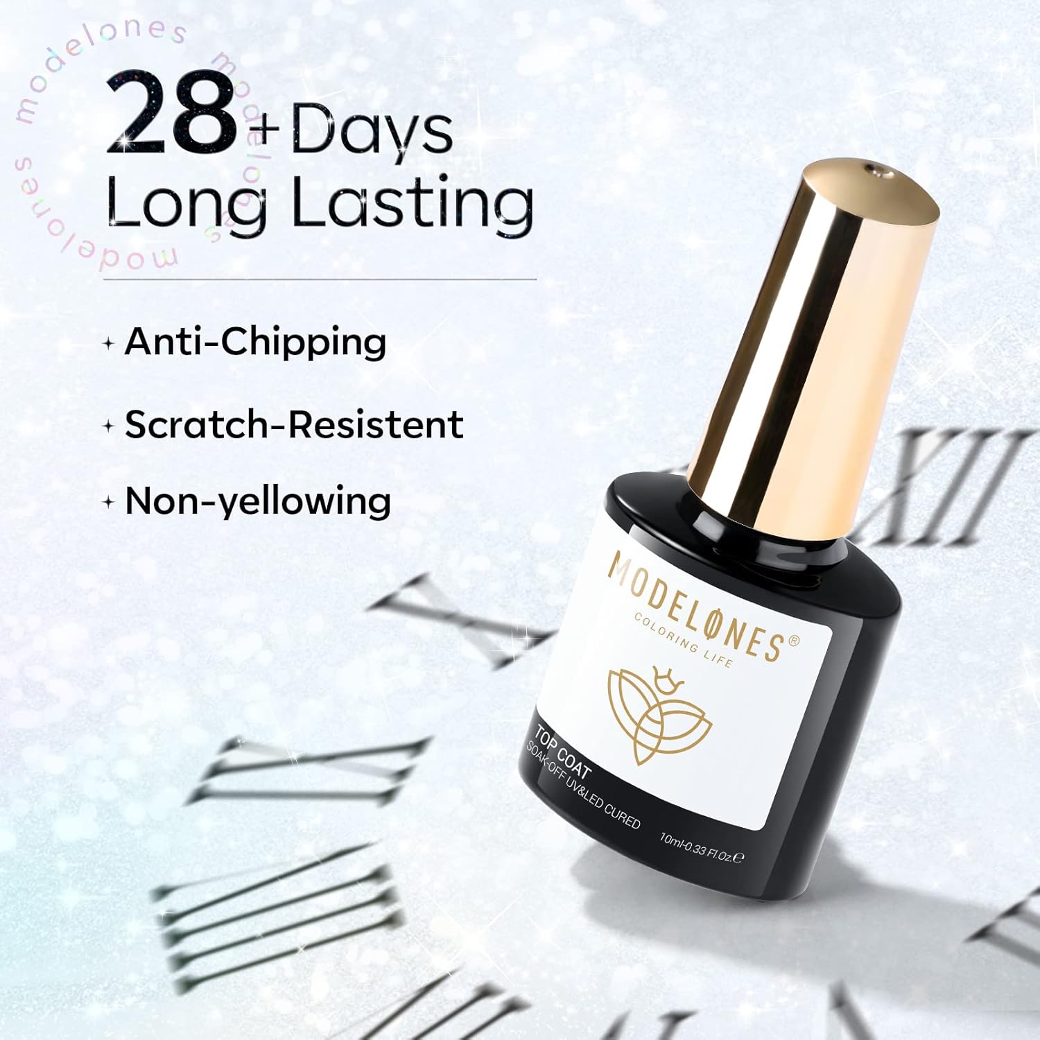 - Upgrade Glitter Finish: This time Modelones adds beautiful iridescent silver mix glitter to the regular clear gel top coat to give us a cost-effective and high-impact manicure experience. It is stll the strong and long lasting gel top coat as we always need. The best part is you can add sparkly glamorous beauty to your mani by adding rainbow shimmer to finish the look, it will be a unexpected-yet, understated and won't appear juvenile way!