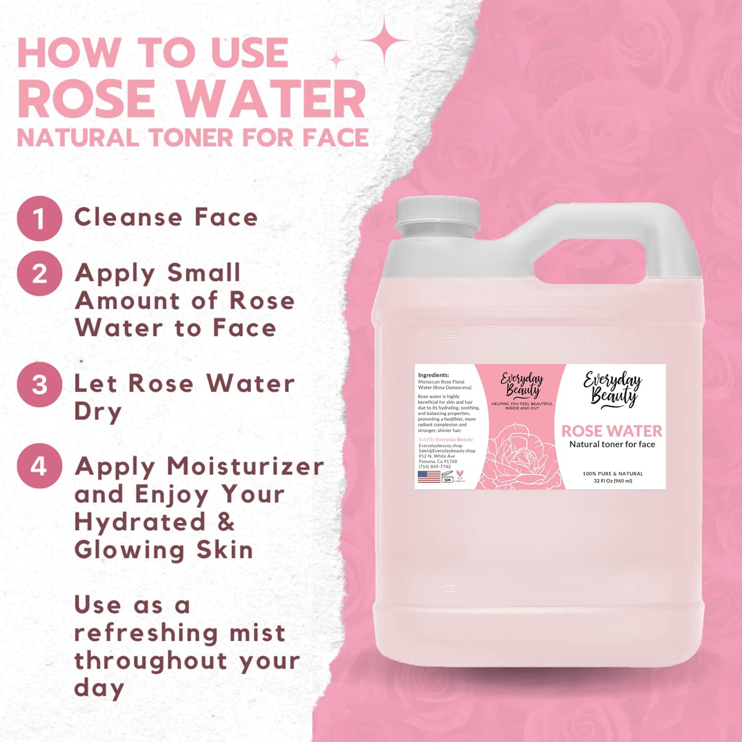 - Product Benefits : Rose water hydrates, tightens pores, soothes skin, and leaves a refreshing scent.