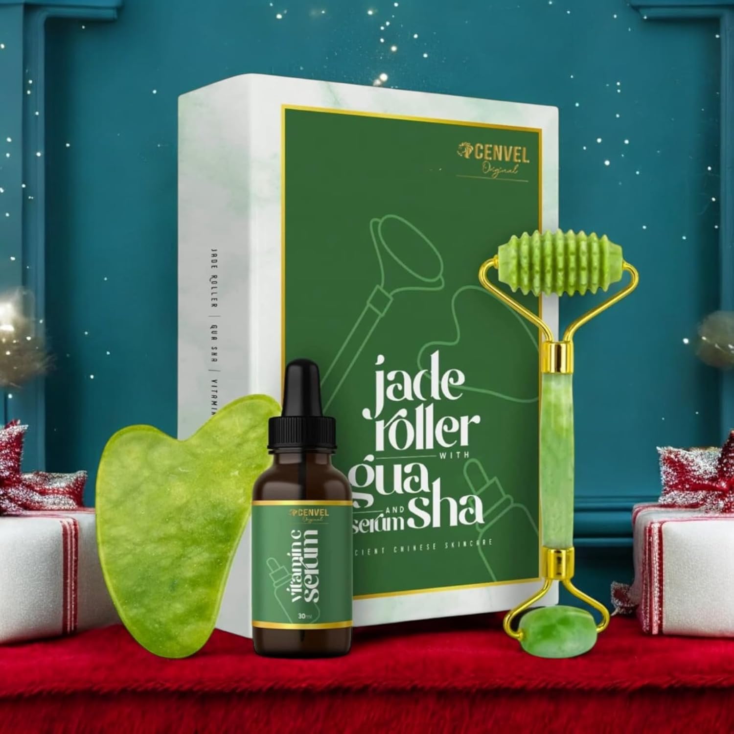 - 🍀100% PREMIUM JADE STONE - Our natural Jade Facial Roller comes with Gua Sha Scraper set and Vitamin C serum for face to give you a glossier, tighter and healthier skin Using this anti-aging beauty tool as a part of your daily routine will help relax your face and body to reduce stress, reduce toxins and stimulate a healthy glow, to eliminate edema, make skin luster, use small rollers on the eye skin to remove black eye circles and eliminate small bags under the eyes.