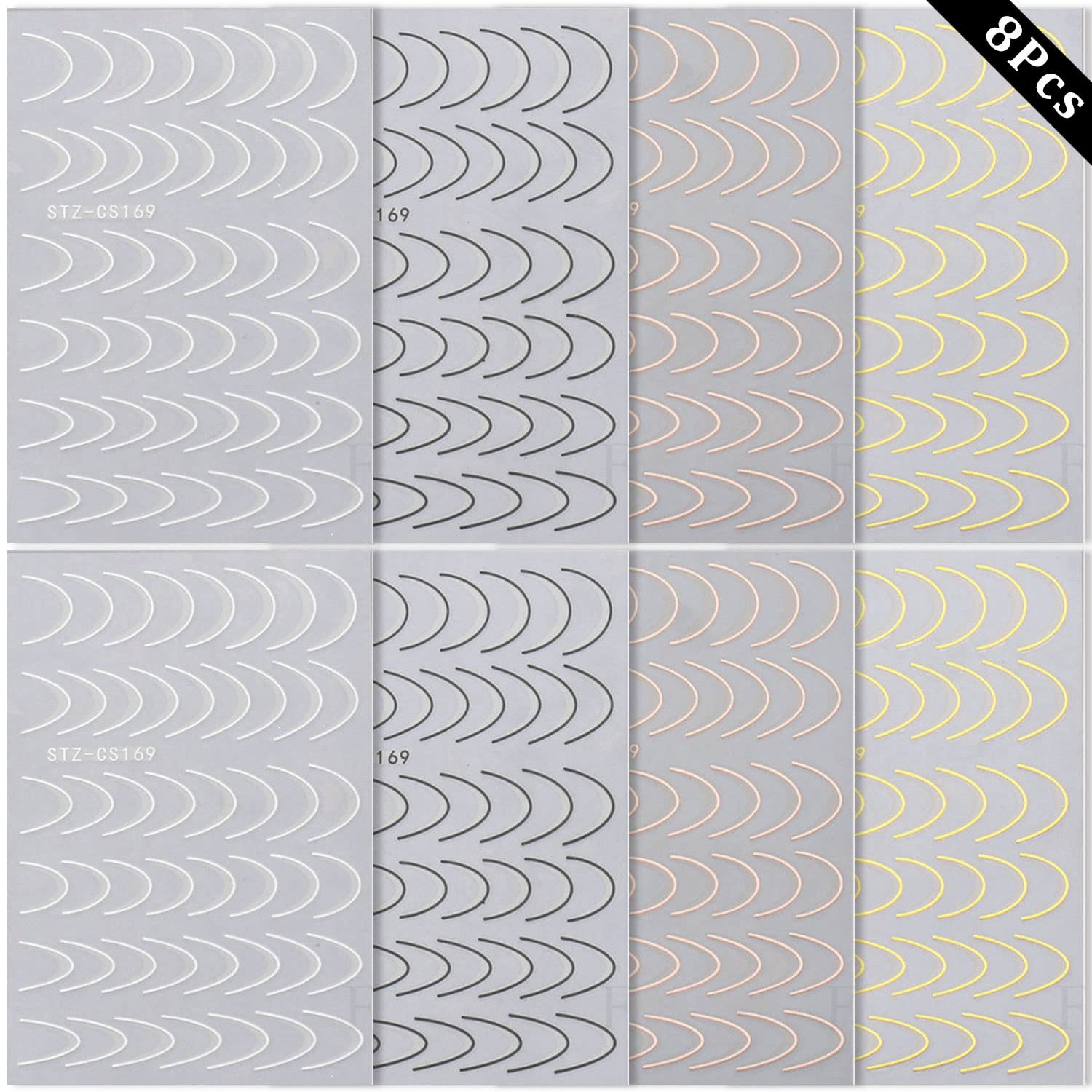 - Classic French Tip Designs-- 8 sheets exquisite French tips nail art decals. 350+ U-shaped line nail designs. Gold/ black/ white/ rose gold 4 color options.