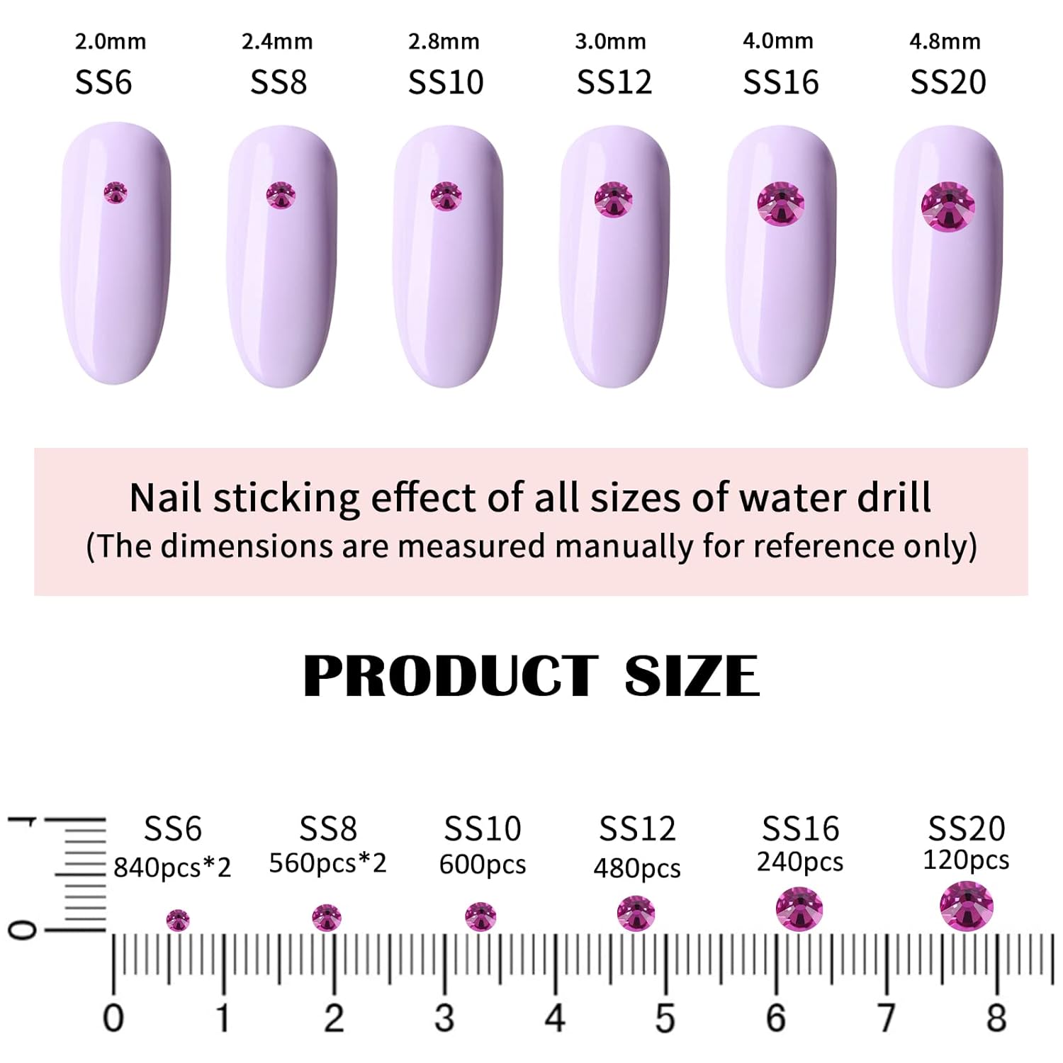 - 💎Product Packaging: Boxed SS6 2MM - 1680 Pcs, SS8 2.4MM - 1120 Pcs, SS10 2.8MM - 600 Pcs, SS12 3MM - 480 Pcs, SS16 4MM - 240 Pcs, SS20 4.8MM - 120 Pcs, 1 pcs Tweezers and 1 pcs picking pen.