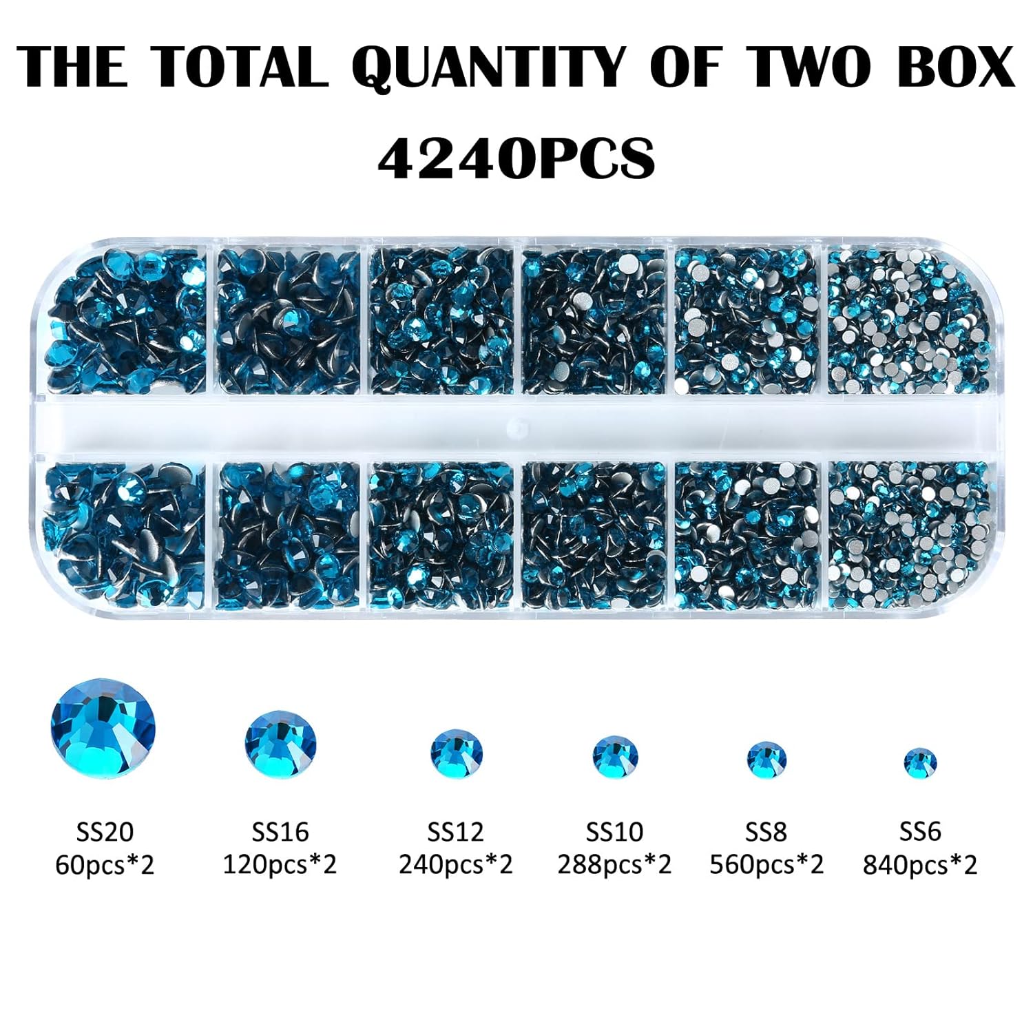 4240Pcs Malachite Blue Flatback Rhinestones 6 Sizes Crystal Diamonds for Nail Art Crafts Clothes Shoes with Tweezers and Picking Pen