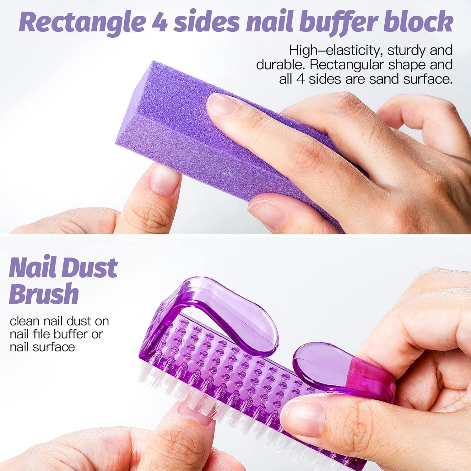 - Sponge Nail Buffer Block: Made of high quality sand surface sponge, high-elasticity. Rectangular shape and all 4 sides are sand surface. Ideal for polishing and smoothing acrylic nails, fake nail tips or natural nails. Washable and reusable. You can use the nail brush to clean nail dust on nail file buffer or nail surface.