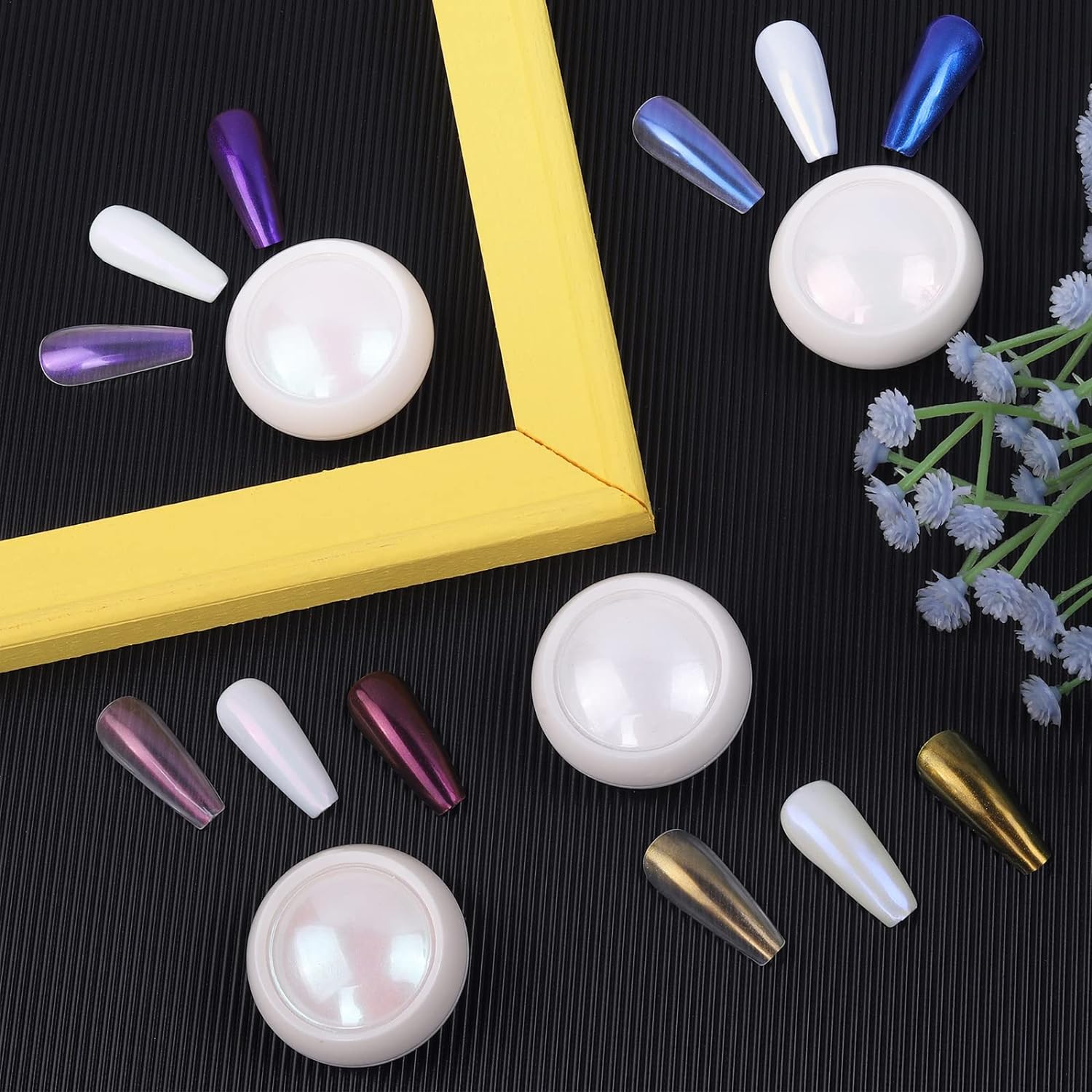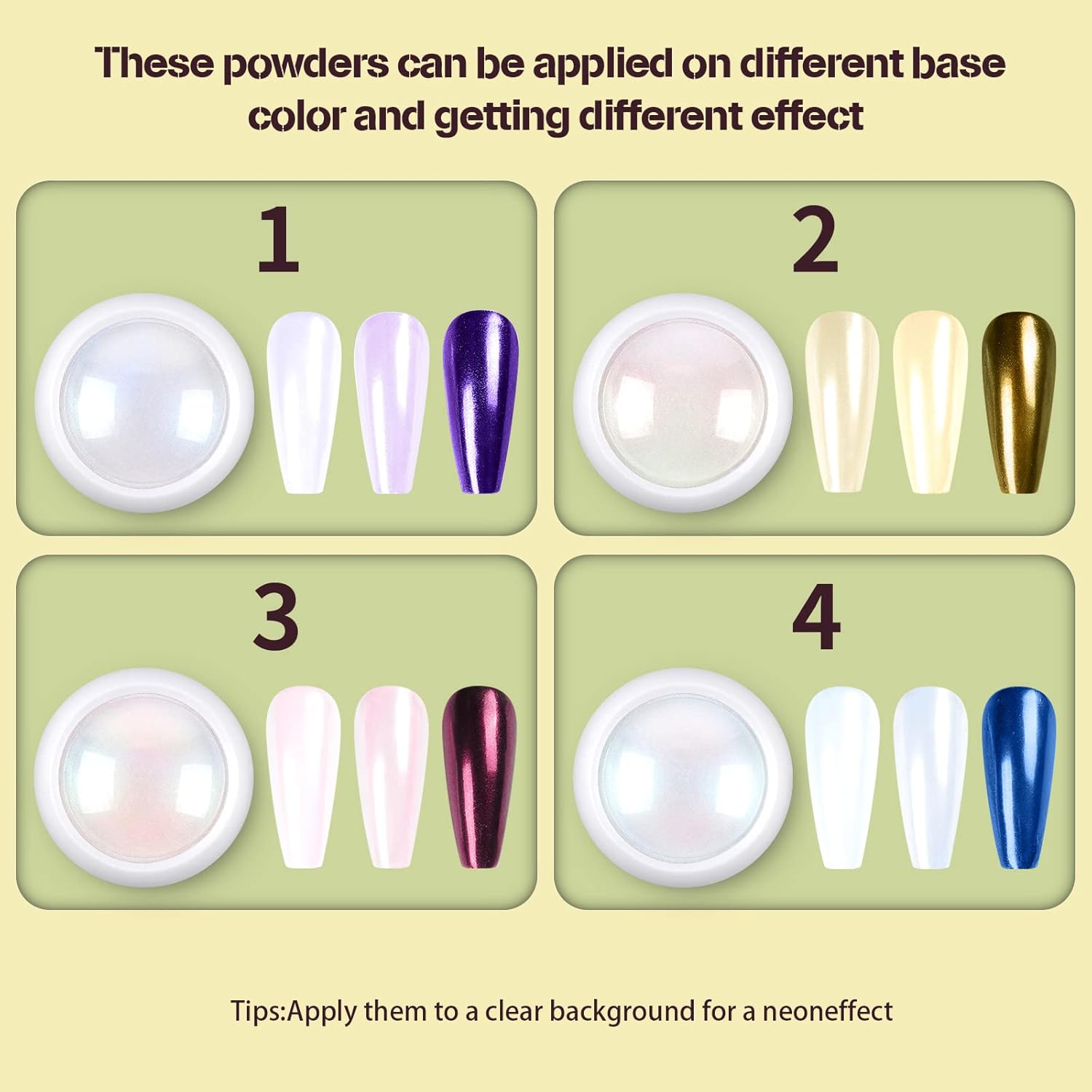- PACKAGE CONTENTS: 4pcs(each 1gram) chrome nail mirror white pearl pigment powders. It needs to be used with gel nail polish and no wipe top coat.