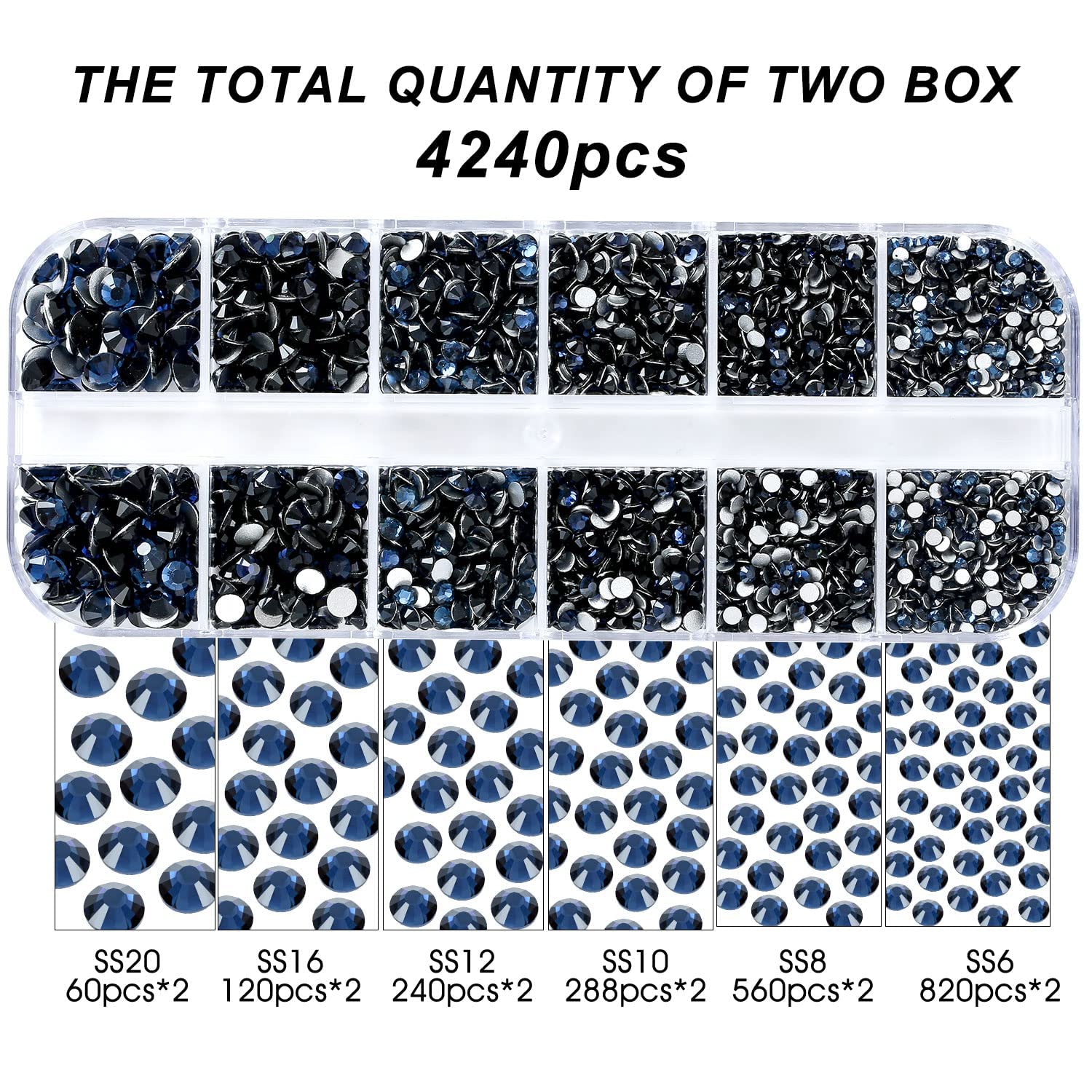 - 💎Product Packaging: Boxed SS6 2MM - 1680 Pcs, SS8 2.4MM - 1120 Pcs, SS10 2.8MM - 600 Pcs, SS12 3MM - 480 Pcs, SS16 4MM - 240 Pcs, SS20 4.8MM - 120 Pcs, 1 pcs Tweezers and 1 pcs picking pen.