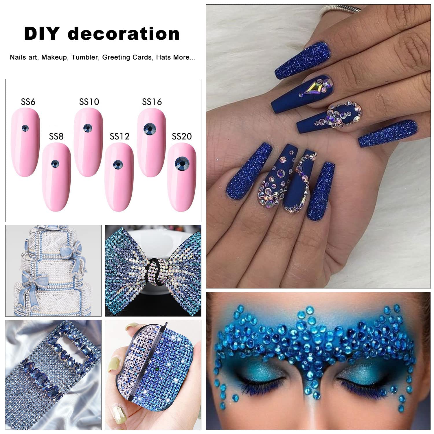 - 💎Uses: You can use rhinestones for nails, art, jewelry, skin, teeth, face, eyes, makeup, glasses, crafts, cardstock, cell phones, phone cases, plastic, glasses, etc.