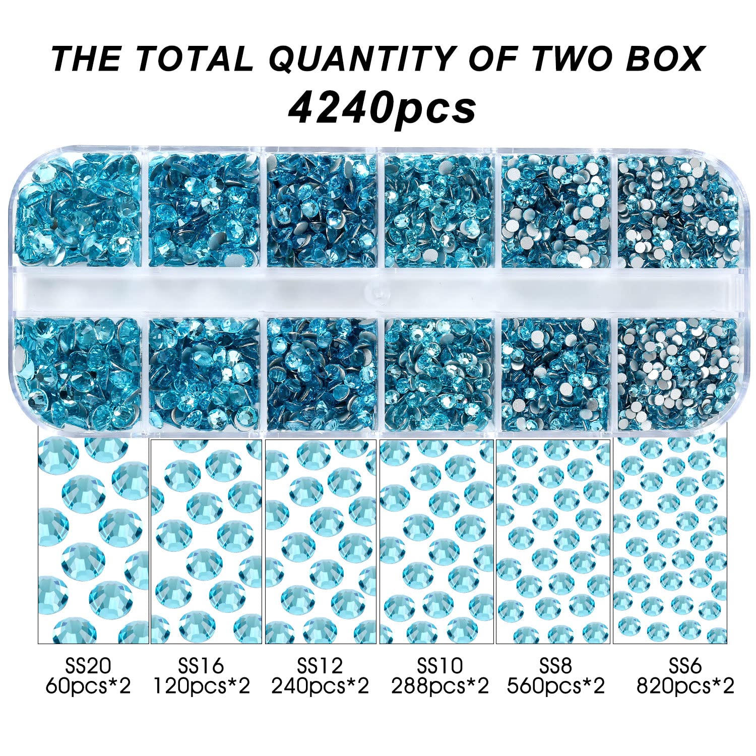 - 💎Product Packaging: Boxed SS6 2MM - 1680 Pcs, SS8 2.4MM - 1120 Pcs, SS10 2.8MM - 600 Pcs, SS12 3MM - 480 Pcs, SS16 4MM - 240 Pcs, SS20 4.8MM - 120 Pcs, 1 pcs Tweezers and 1 pcs picking pen.