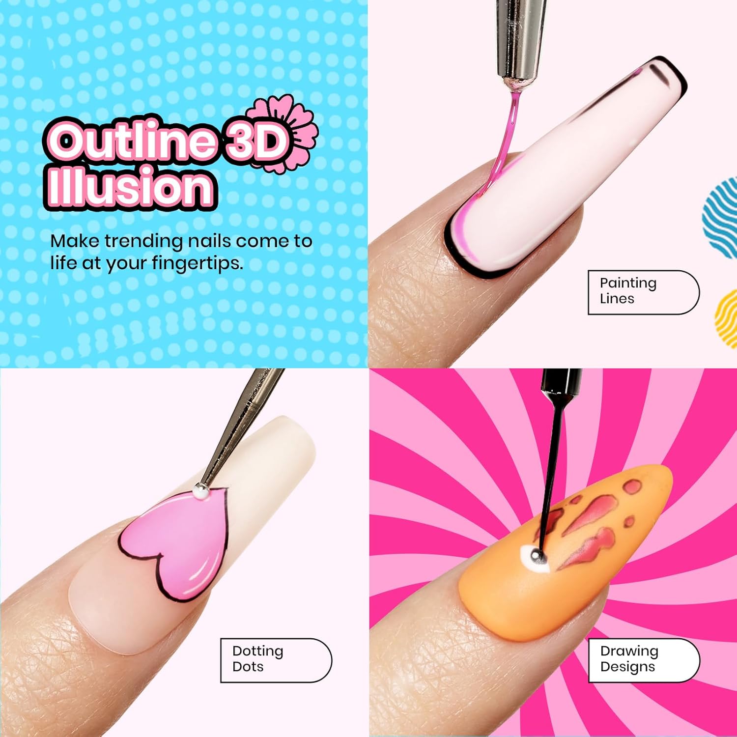 - Summer Gel Polish Kit: 18 colors gel nail polish colors (0.17oz/5ml each bottle) + 2 colors x liner gel polish(0.17oz/5ml each bottle) + 3 x base coat and glossy matte top coat (0.25oz/7.5ml each bottle) + 1 nail art pen. Perfect for those trendy squiggly lines abstract painting that is so popular now, also works perfectly for adding a French line!
