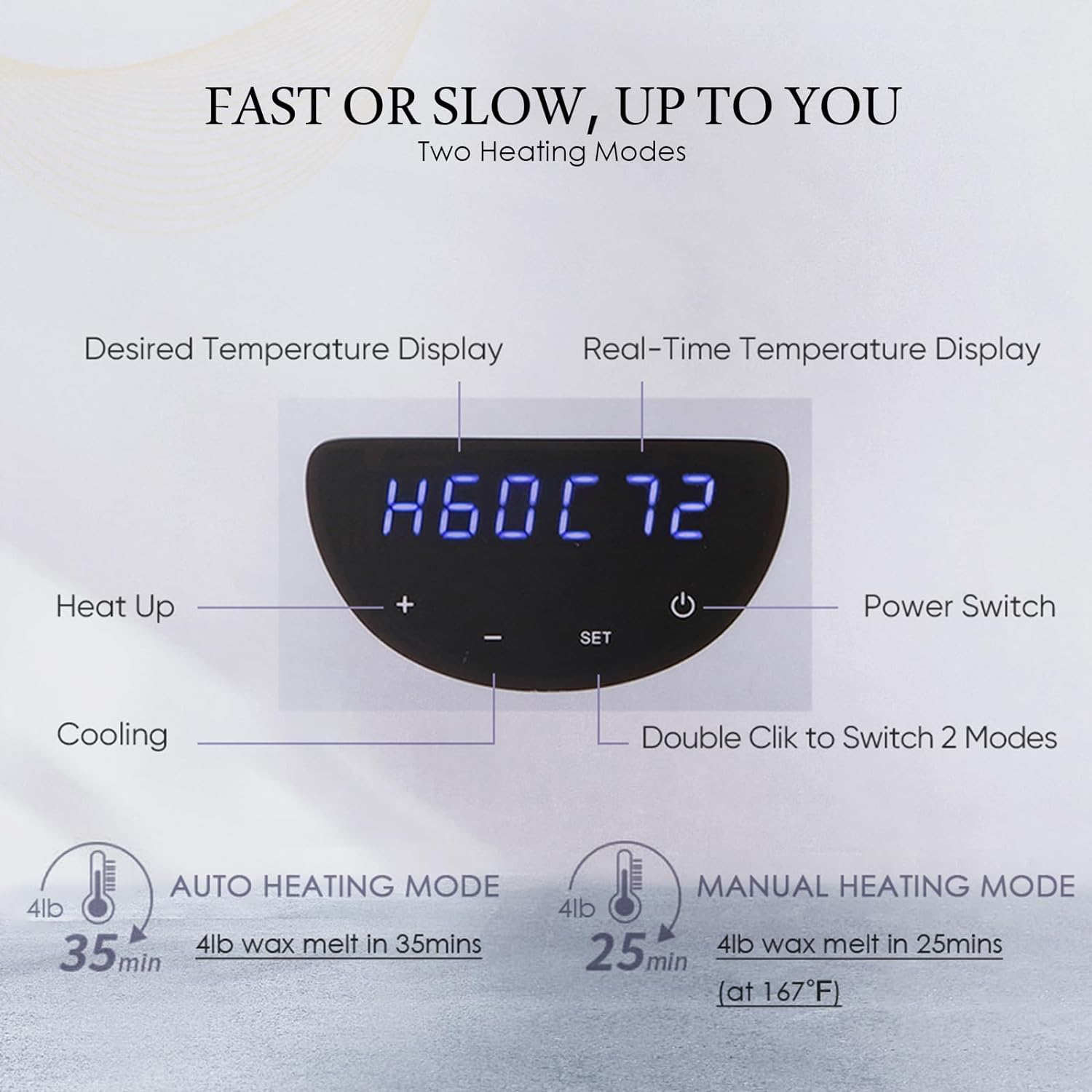 - 24 HOURS SMART BOOKING,REAL TIME TEMPERATURE CONTROL WAX MACHINE - Our paraffin treatment machine is implanted with a patented extra-large thermal control system, bottom probe device, upgraded dual-screen LED panel, real-time monitoring of temperature changes, and a sound prompt will be given at a suitable temperature of 131°F, and the machine will automatically enter the constant temperature mode。 No scalding anymore when enjoying your paraffin wax spa.