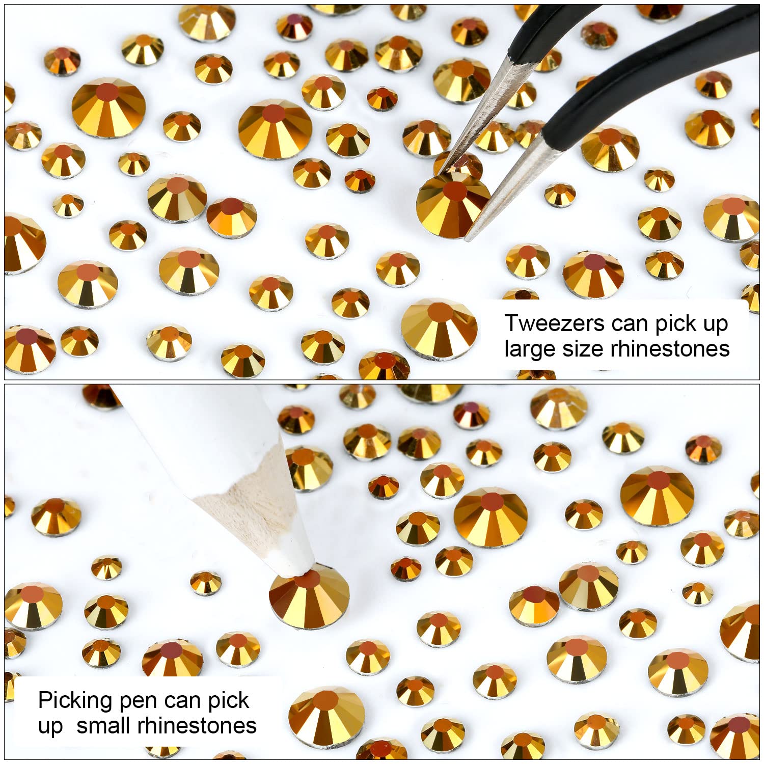- 💎Use tweezers and Picking Pen gem picker to pick rhinestones, There is no glue on the bottom, additional nail gel is required, or other professional glue for makeup or nails. Can use E6000 super glue to fix on crafts, art decoration. not hotfix.