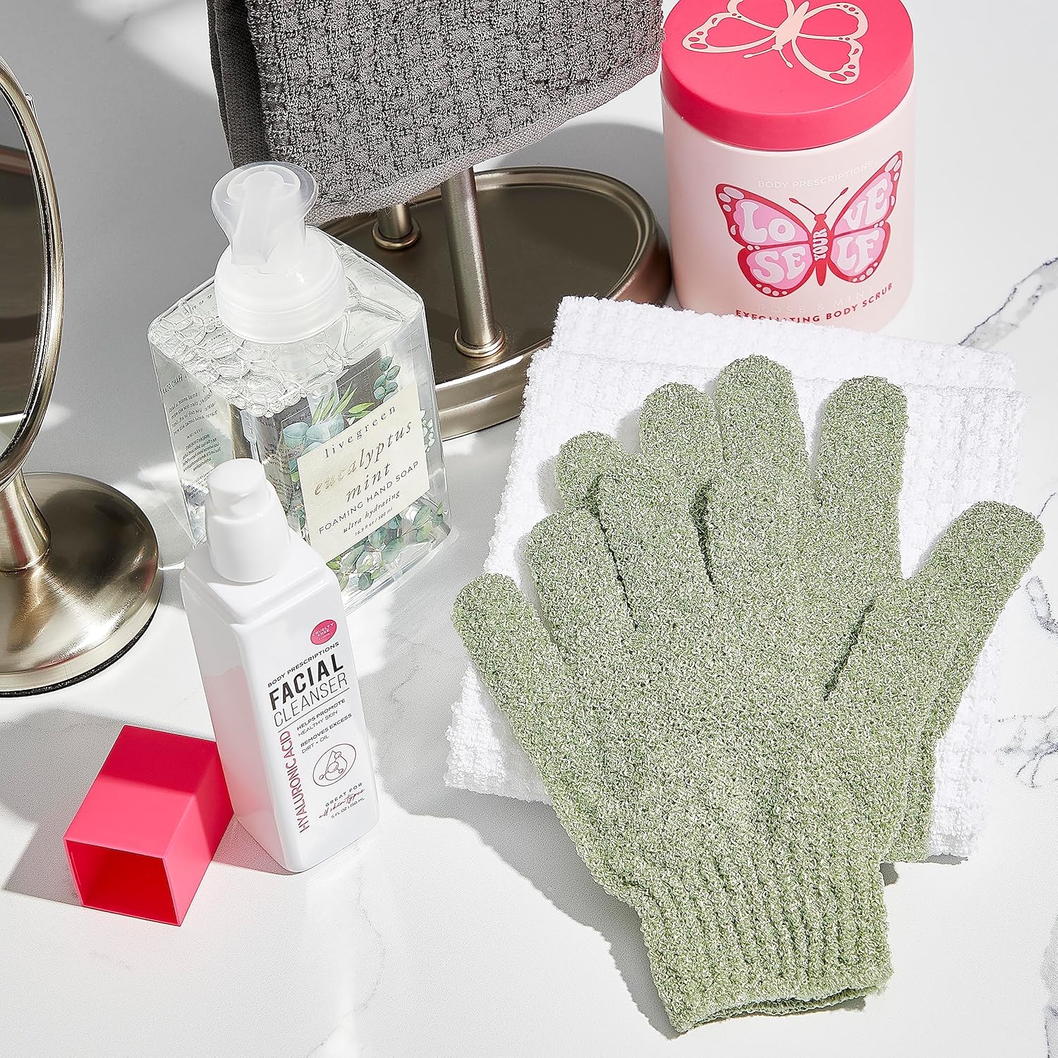 Body Prescriptions Exfoliating Body Scrub – Body Cleanser for Nourished, Ultra-Smooth Skin, Exfoliating Gloves