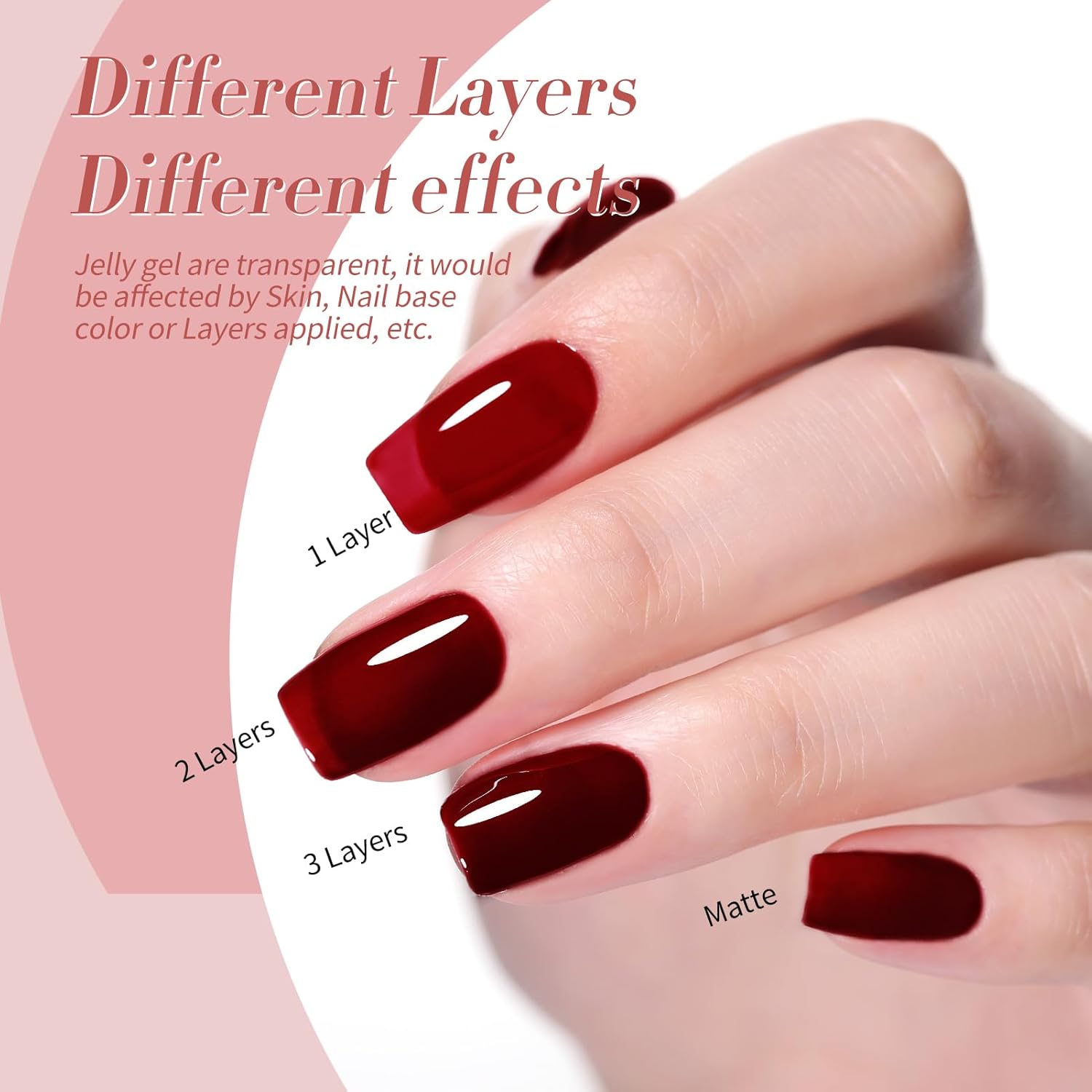 - EASY APPLICATION AND GOOD TENACITY: The series of jelly wine red gel nail polish can lasting for 21+ days with perfect shine or matte gel nail polish under proper application - With base gel top coat under the full application Process.