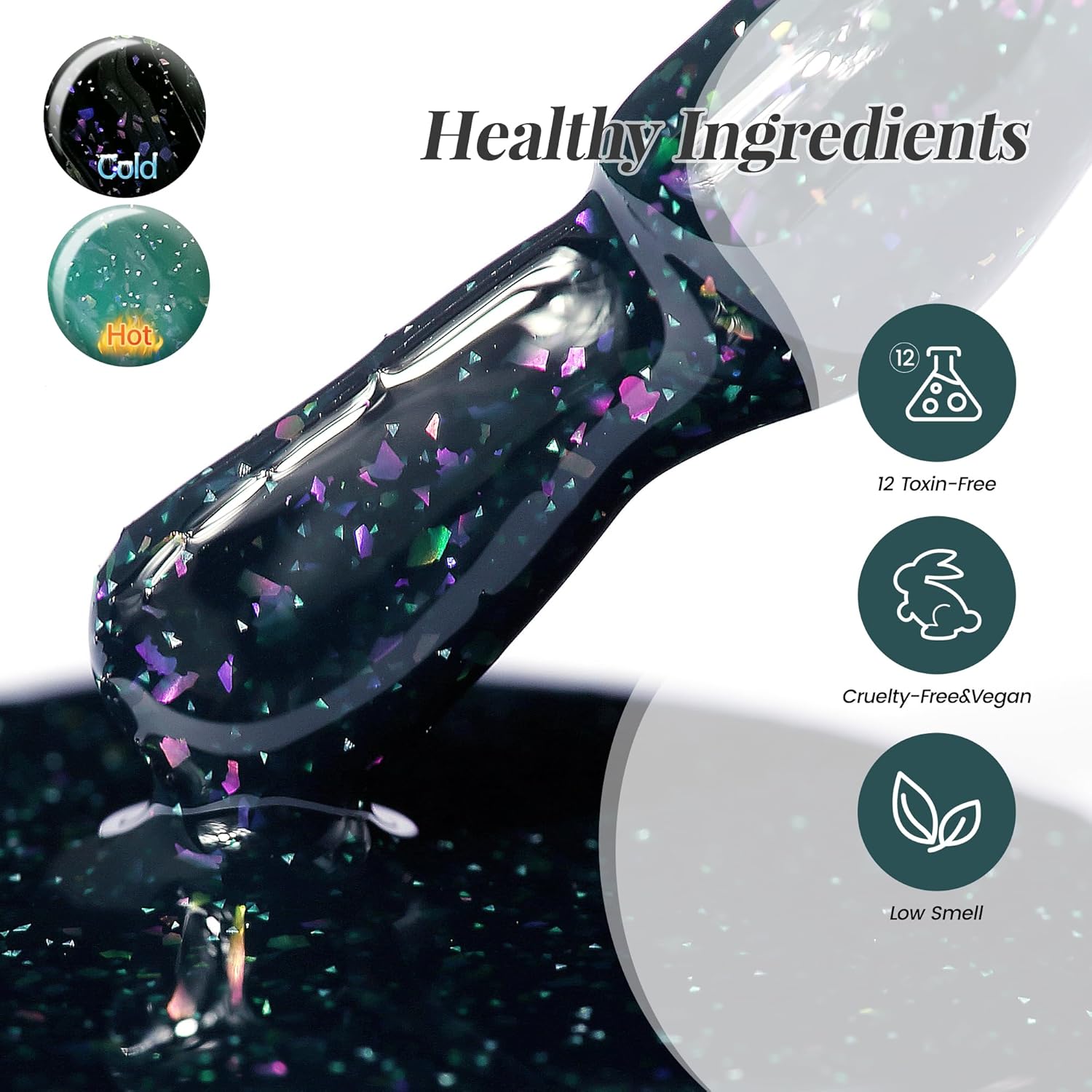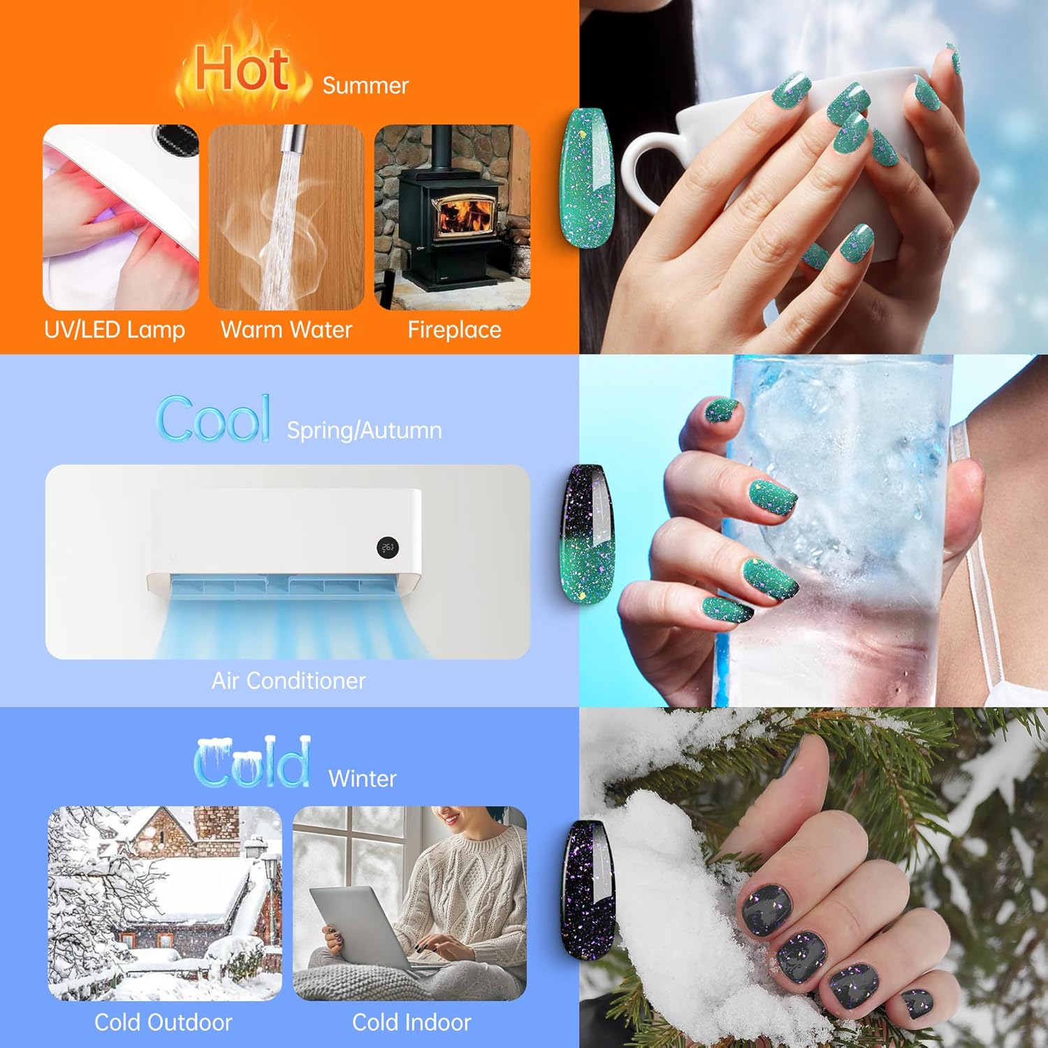 - Color-changing Brocade Glitter Gel :The gel changes color when the temperature exceeds 31°C or falls below 23°C, darkening as it cools and lightening as it warms. The colorful glittery brocade glitter in the gel creates a dazzling and radiant nail look.