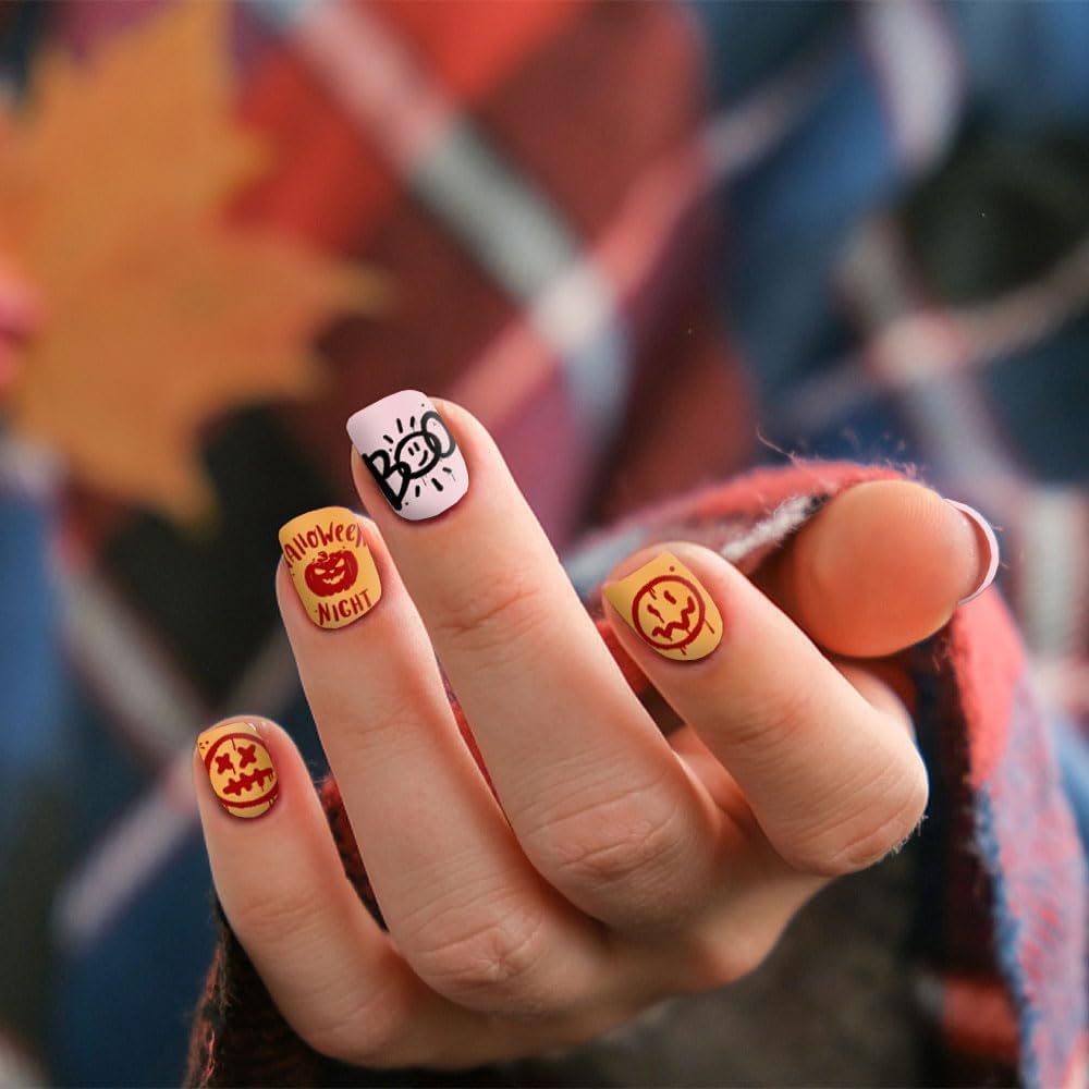 - Package Contains: 6 pieces Halloween nail stamping templates, including pumpkin, spider web, bat, buffalo plaid background, pumpkin face, ghost, grave and Halloween words, etc.. Each template contains a lot of sketches and offers you multiple choices to create proper style and make your nail more attractive. Notice: the stamp and scraper are not included.