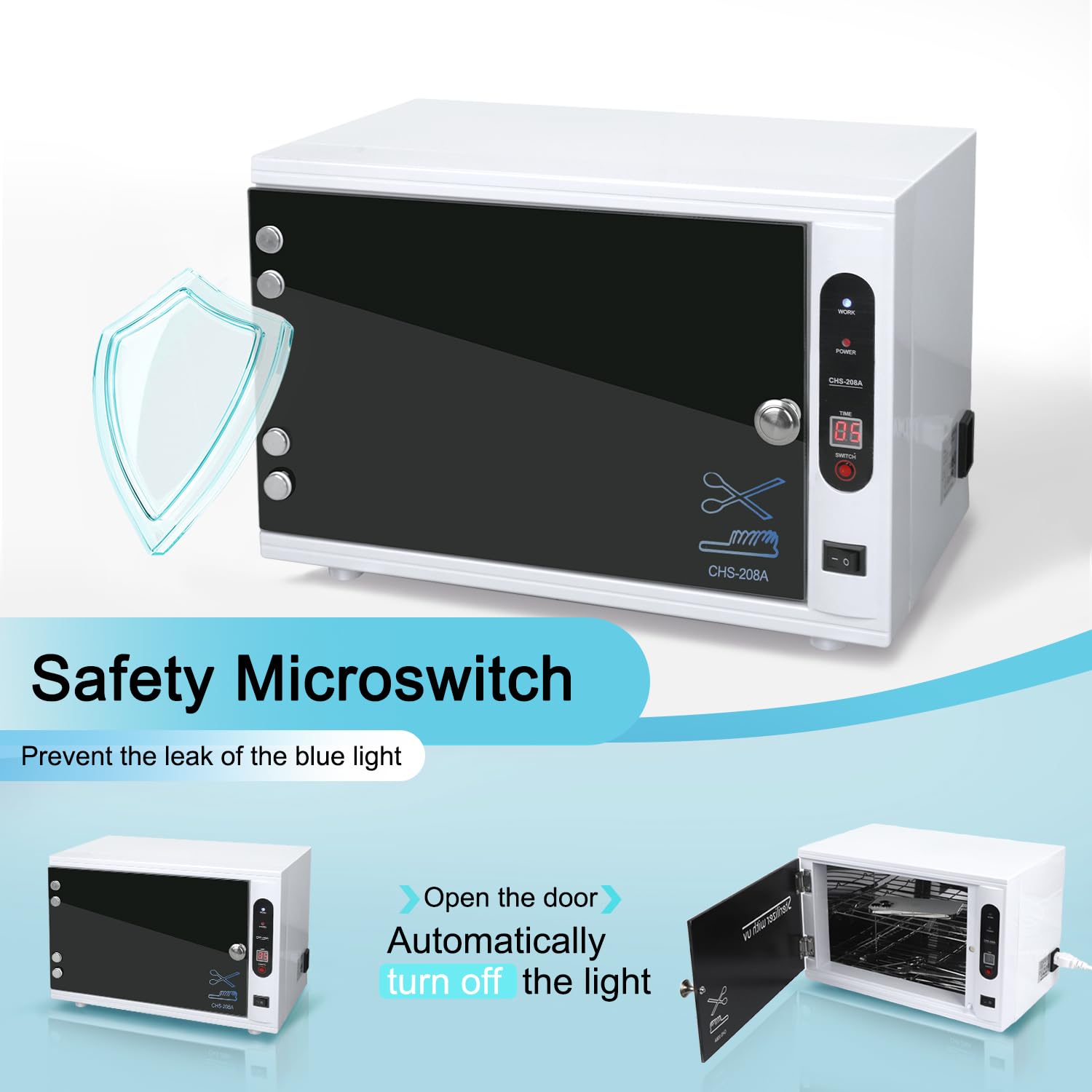 • ✅ LED TIMER DISPLAY LARGE CAPACITY CLEANING MACHINE - The Light cleaner has a sturdy glass door, a metal shelf, and an inner cabinet made of stainless steel with a brilliant led light. In order to keep dangerous rays within and prevent unintentional exposure, the light cabinet has an insulated door and an auto shut-off system. The light goes out when the door is opened, and it comes back on when the door is shut. Nail tool cleaning cabinet for esthetician also comes with two removable trays for easy storage.