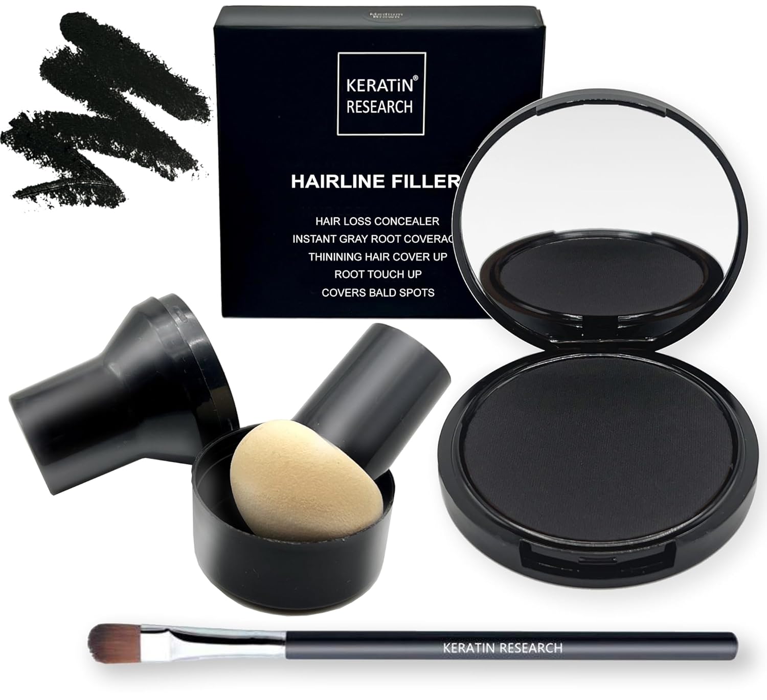 KERATIN RESEARCH Hairline Filler Unisex Mineral Powder Root Touch-Up Hair loss Concealer Scalp & Beard Bald Patch Coverage Fibers for Thinning Hair Waterproof Organic Natural look (BLACK, XL)
