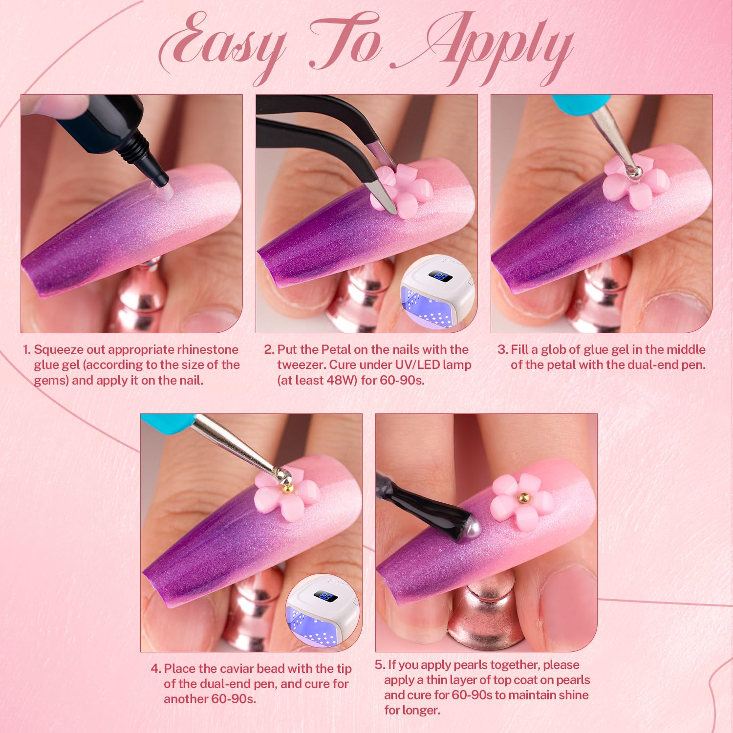 • ✿ Package Content -- It comes with assorted nail charms, including colorful flower nail charms with mini metal caviar beads, 75 pcs nail bow charms, shiny clear & AB glass rhinestones, white half round pearls. A tube of 15ml nail charm glue (UV curing needed), tweezers and picking pencil are also equipped for your convenience.