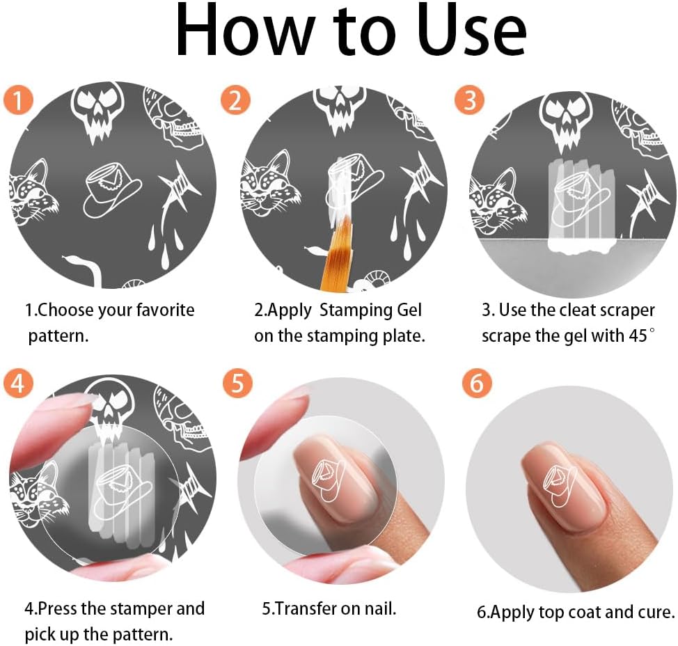 - Easy to Use: You can transfer design template from plate to your nail using professional nail stamping polish gel, and can also be used to reverse stamping, just transfer image to stamper and fill outlines with different varnishes or paint using a brush or dispensing tool, nail stamping plates set creating your unique decals or stickers.