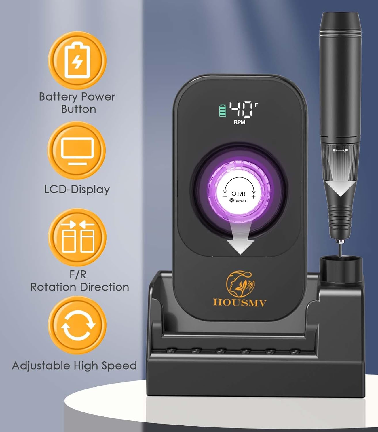 - ๐๐จ๐ง๐ -๐ฅ๐๐ฌ๐ญ๐ข๐ง๐ ๐๐๐ญ๐ญ๐๐ซ๐ฒ ๐๐ข๐๐: Our rechargeable nail drill features a large capacity battery, which offers 8-10 hours of usage just on 3 hours charge. The well-designed intelligent LCD display shows the rotation direction, speed, and remaining battery level, allowing you to conveniently adjust the speed and stay informed about the battery status.