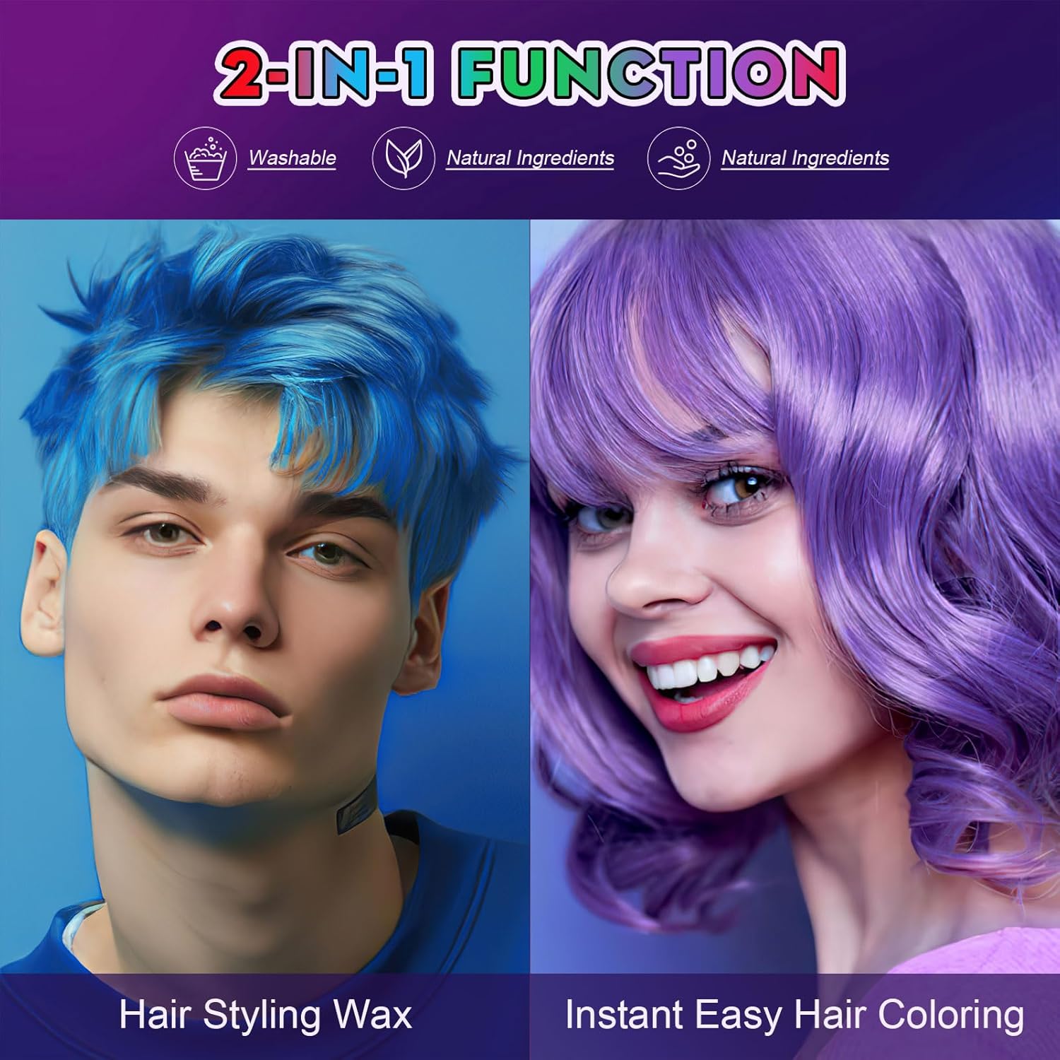 - 🌈 【4 Colors Temporary Hair Color Wax – Green, Purple, Blue, Red】Fun, Washable Hair Color for Kids, Teens & Adults;Create bold and vibrant hairstyles anytime, anywhere! This temporary hair dye wax offers a fun and damage-free way to try new colors—easy to apply, easy to wash out, and non-sticky. No salon visits needed!
