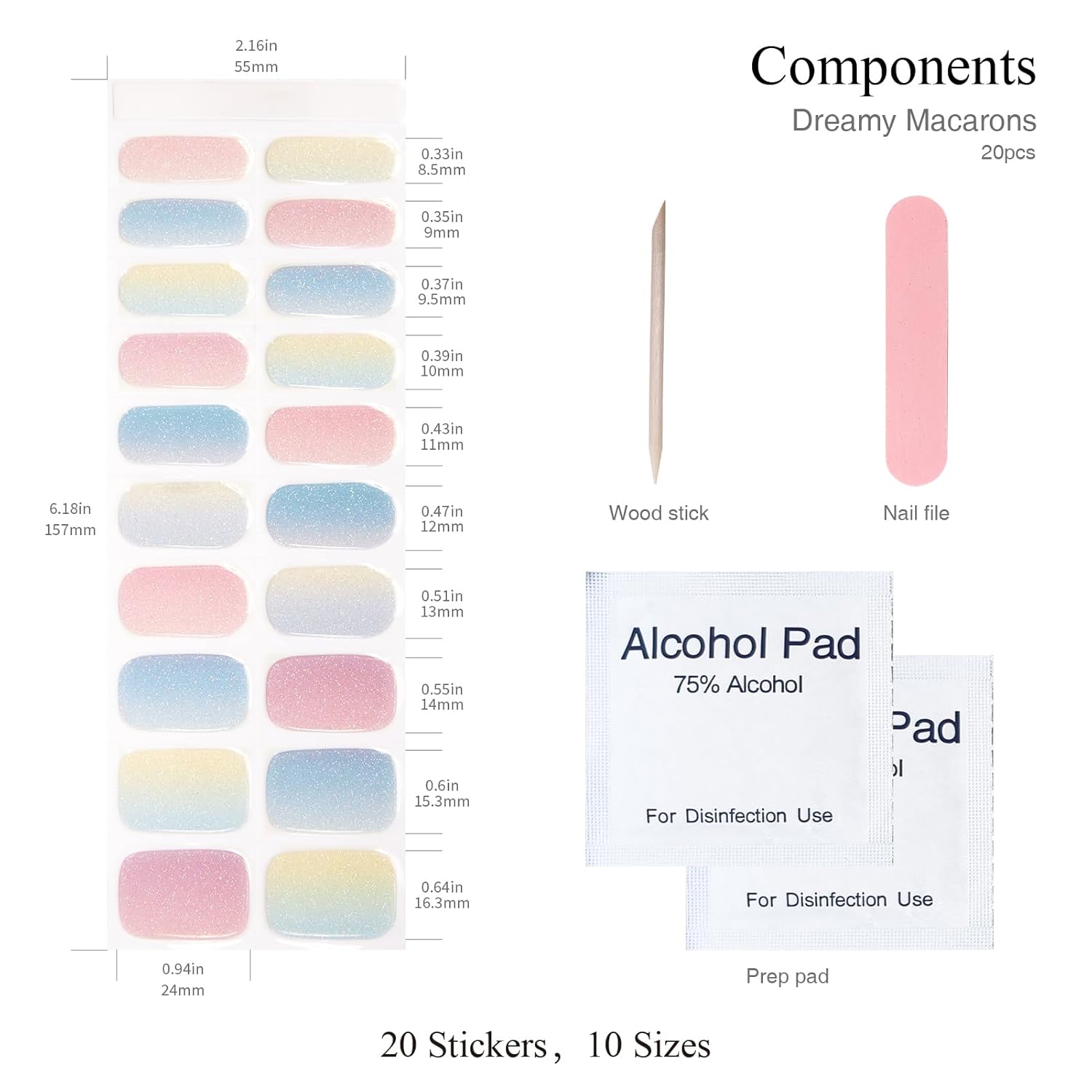 Semi Cured Gel Nail Strips, 20 PCS Gel Nail Stickers Work with UV Light, Salon Quality & Easy to Use - Dreamy Macarons