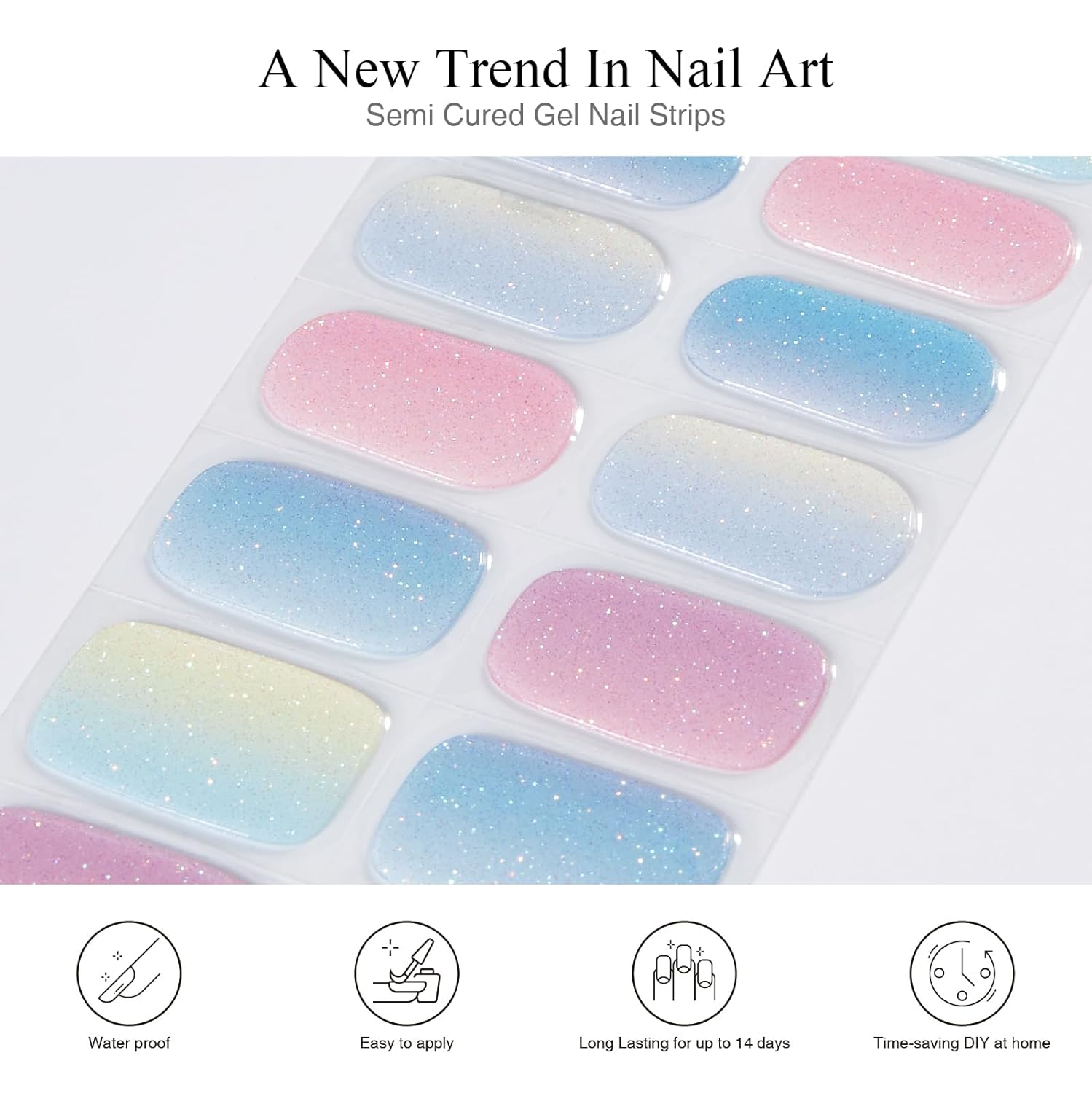 - 【REAL GEL NAIL STRIPS SET】Our nails strips are made with real gel, which means they are only 60 percent cured so they remain stretchy and flexible for application.Unlike flimsy nail stickers, these strips are supposed to feel like and last as long as a gel manicure.You don't get manicures anymore thanks to these semi cure gel nail strips that keep your nails damage-free.