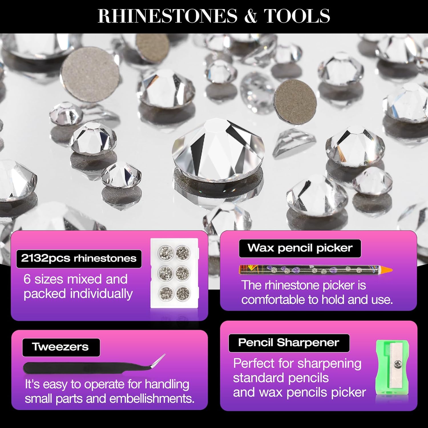 - Rhinestones: Pack of 2132 Pieces Crystal Clear Rhinestones, mixed 6 sizes, SS6 (1.9-2.0mm), SS8 (2.3-2.5mm),SS10 (2.7-2.9mm),SS12 (3.0-3.2mm),SS16 (3.8-4.0mm),SS20 (4.6-4.8mm).