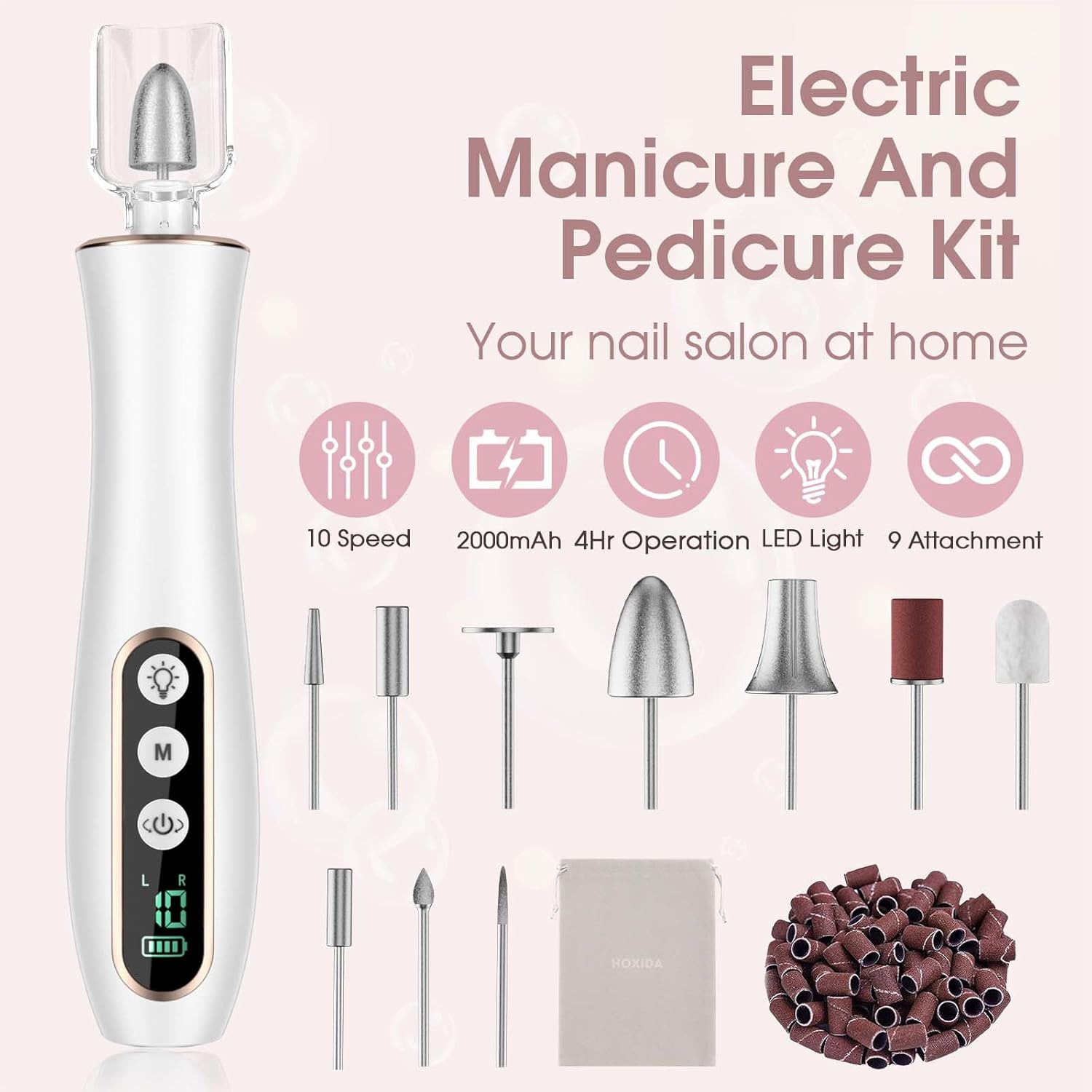 - Sturdy, Low Noise, Low Heat : Hoxida manicure and pedicure tools kit is built to last, with a powerful yet quiet motor with smart heat dissipation, keep the pedicure drill machine is in low noise, low heat while using it. a perfect home pedicure manicure kit for doing your own mani and pedi.with ergonomic body design for comfortable holding, speed and direction controlling. Easy to use, enjoy a salon-quality professional manicure pedicure at home.