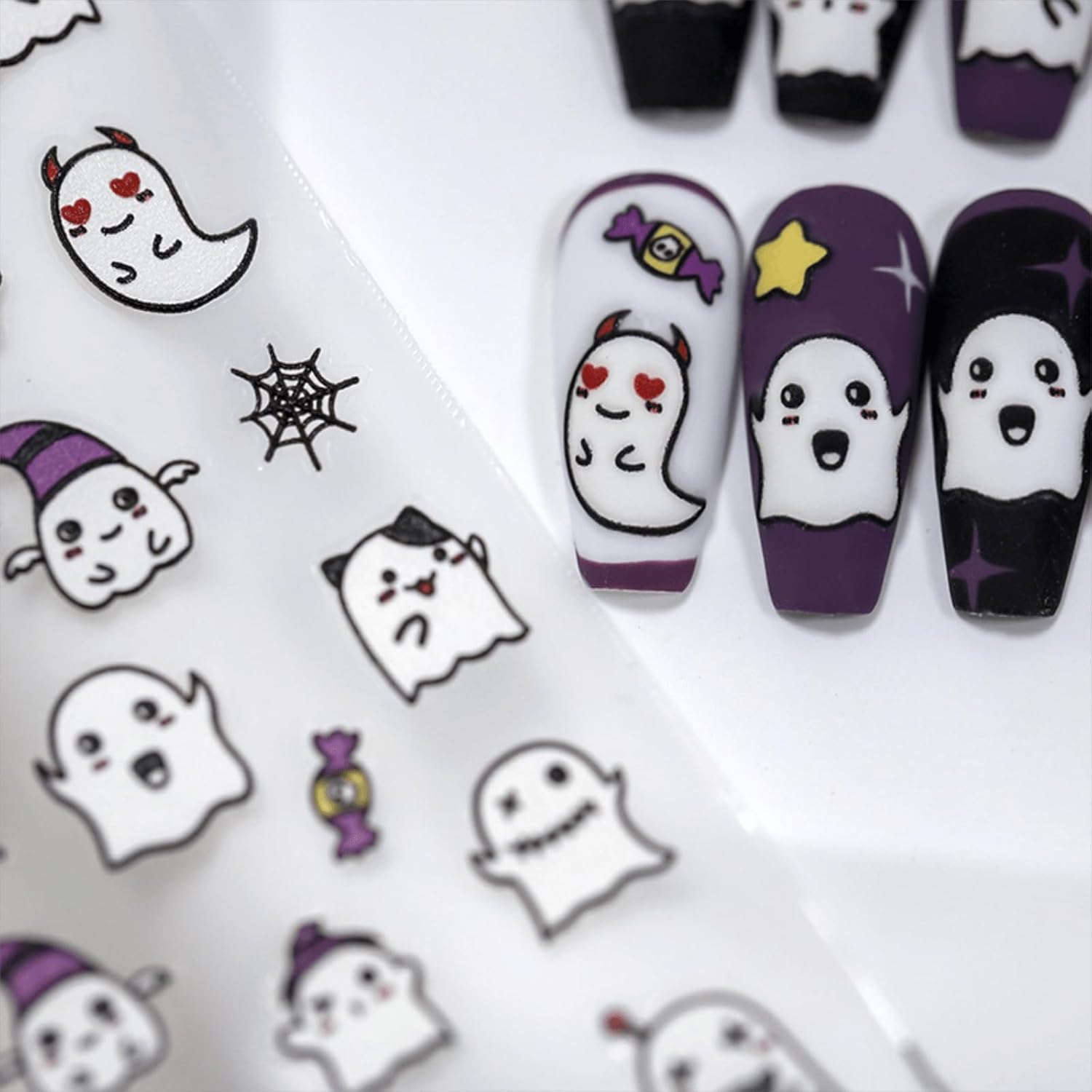 - 【Halloween Nail art Stickers】You will get 2 sheets Halloween nail stickers in one set of different cute ghost nail stickers for nail art, satisfy all your love for beautiful nails, a variety of elements for you to choose from to DIY your own nail art design.