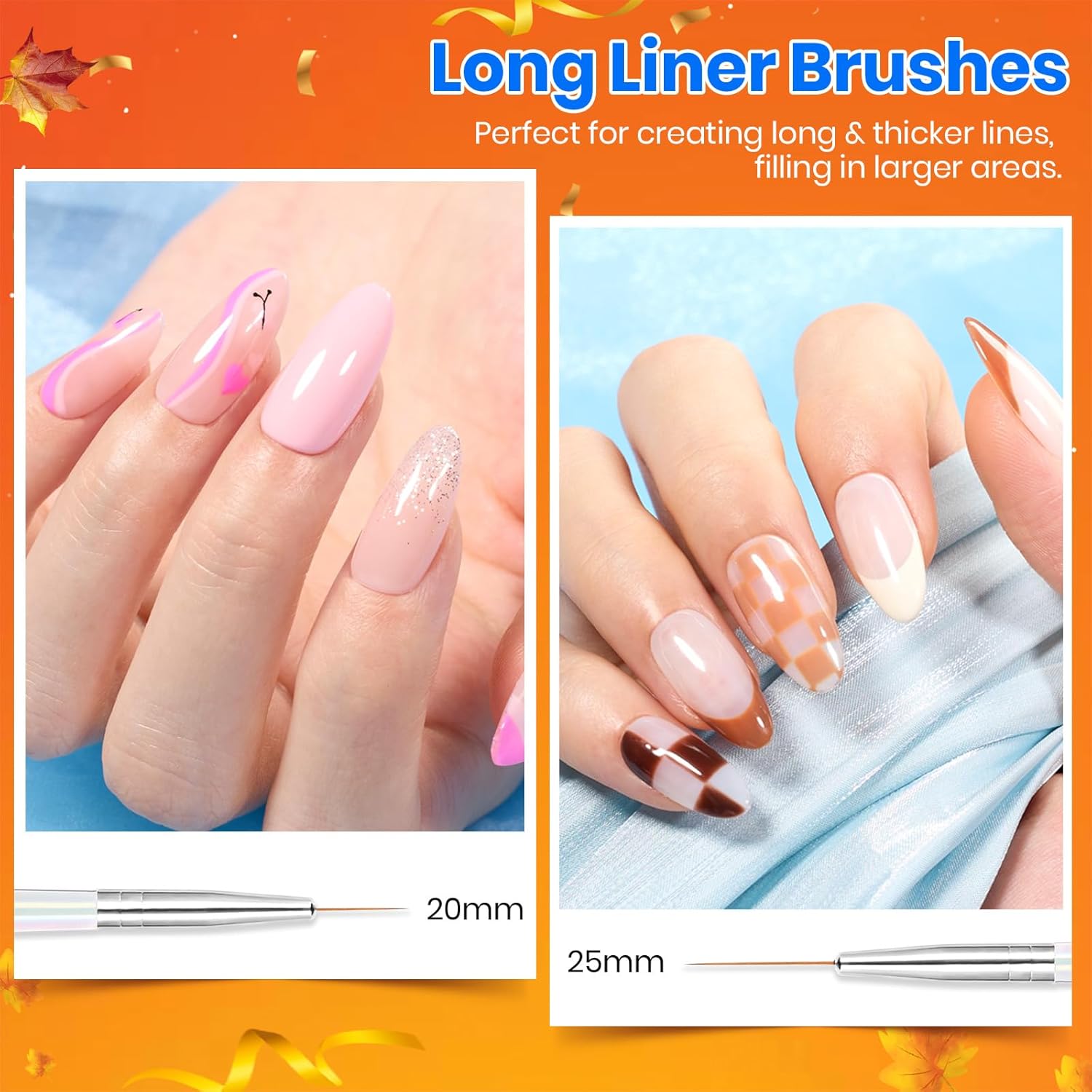 - Variety Lengths: Carefully selected 5 different lengths of liner brushes, including 7mm short brushes, 11mm and 15mm medium-length brushes, and 20mm and 25mm long brushes, specifically designed for nail art enthusiasts to easily tackle fine short lines, complex patterns, 3D nail gel designs, floral and geometric designs, and more.