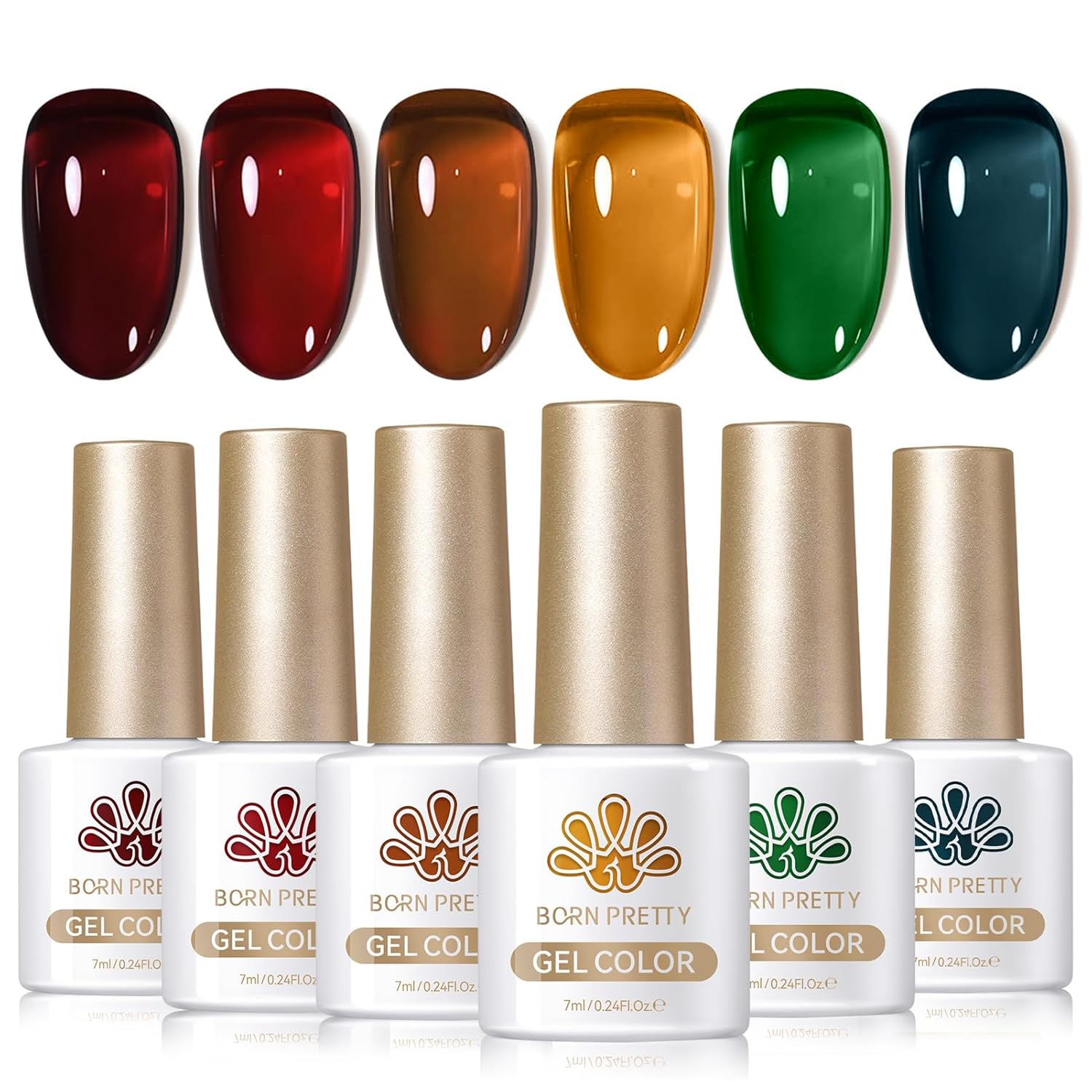 - PACKAGE CONTENTS:6 Bottles BORN PRETTY 7ml Brown Red Orange Green Blue Jelly gel nail polish set. Inspired by MOST POPULAR GEL COLOR. You'll be dizzy with delight wearing this jelly gel nail polish. 1 layer, 2 layers and 3 layers are different effect.