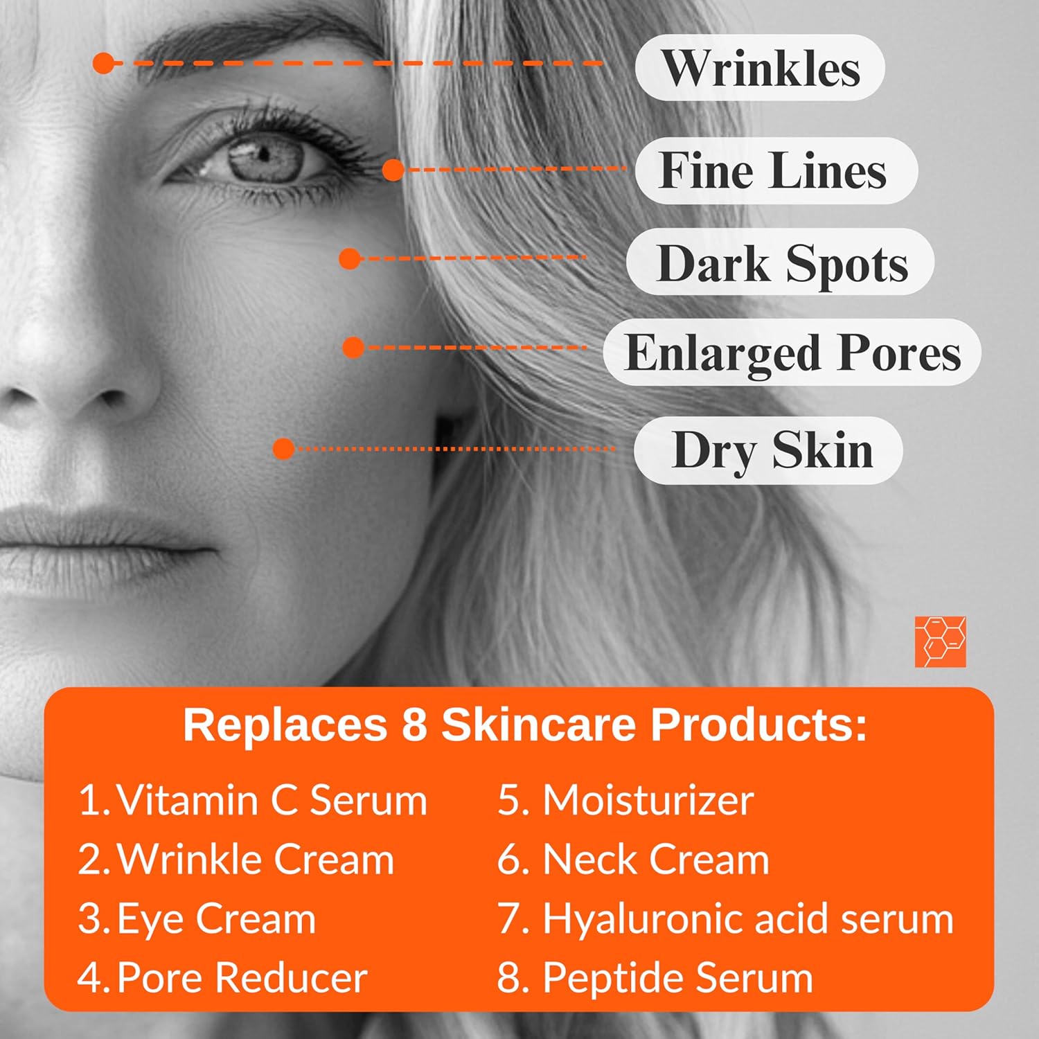 • Reduces Fine Lines and Wrinkles: Powerful wrinkle fighting ingredients like niacinamide, panthenol, ceramides, Tridecapeptide-1, Palmitoyl Tripeptide-5, & Sodium Acetylated Hyaluronate.