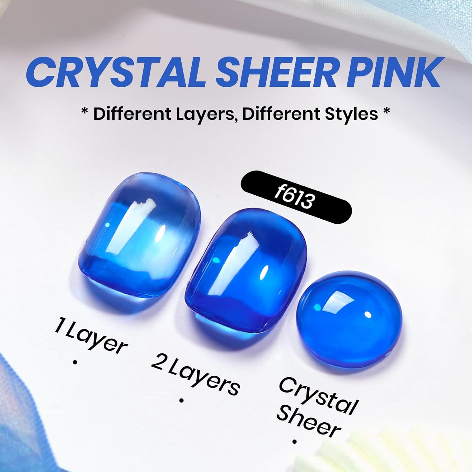 - 【Jelly Blue Sheer Gel 】Apply several layers to build up the color from clear translucent to solid opaque. Each layer, whether one, two, or three layers, creates a different effect. This jelly blue gel polish is UV gel and need to be cured 60-120s. (Note: It must be used with a base coat and top coat, which are not included and need to be purchased separately)