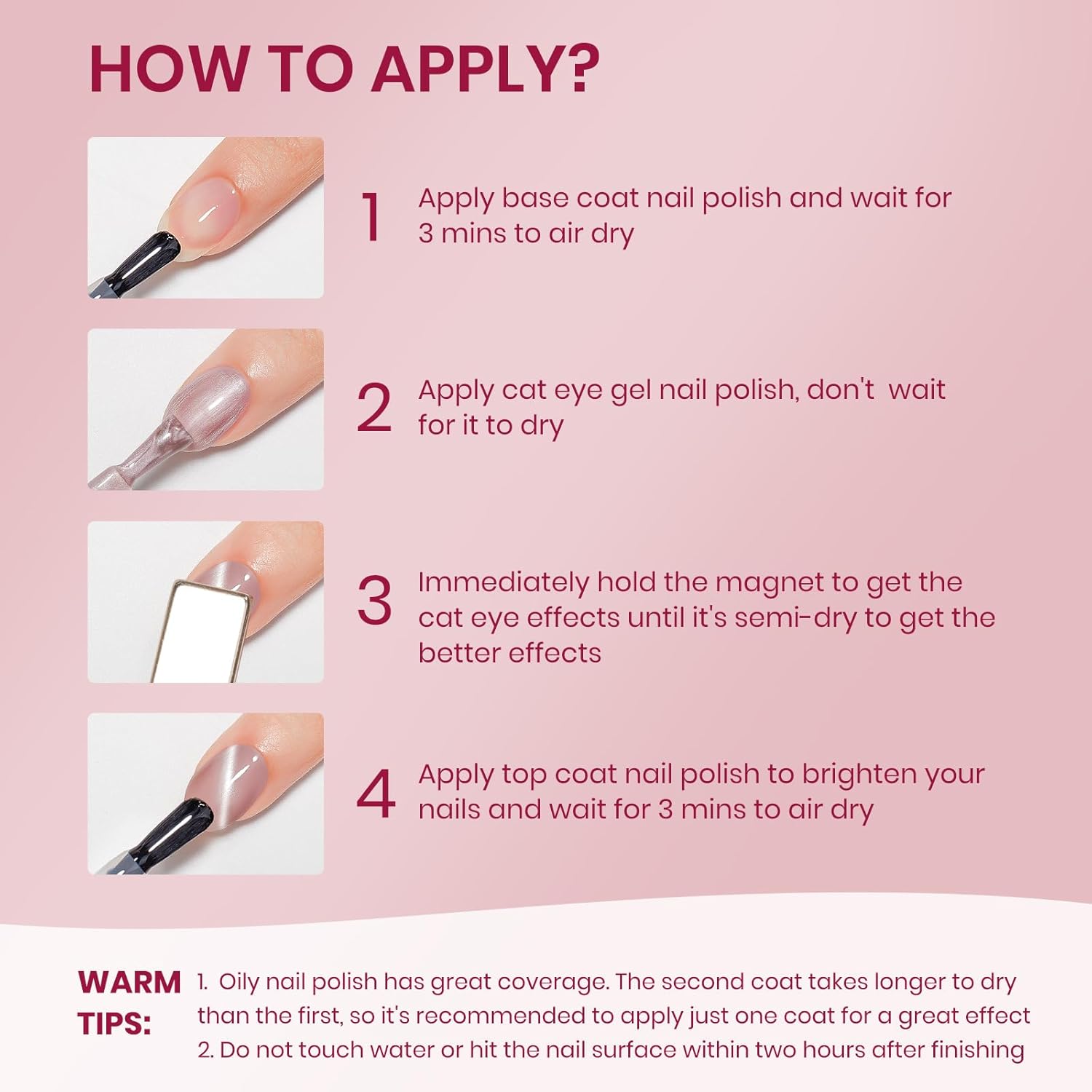 - Important Tips: 1. When the nail polish is not dry yet, it will be fluid. Use magnets to hold it in place until it's semi-dry, then take them off for a sharp cat-eye look 2. Do not touch water or hit the nail surface within two hours after finishing to avoid peeling; 3. Base and top coat nail polish art necessary