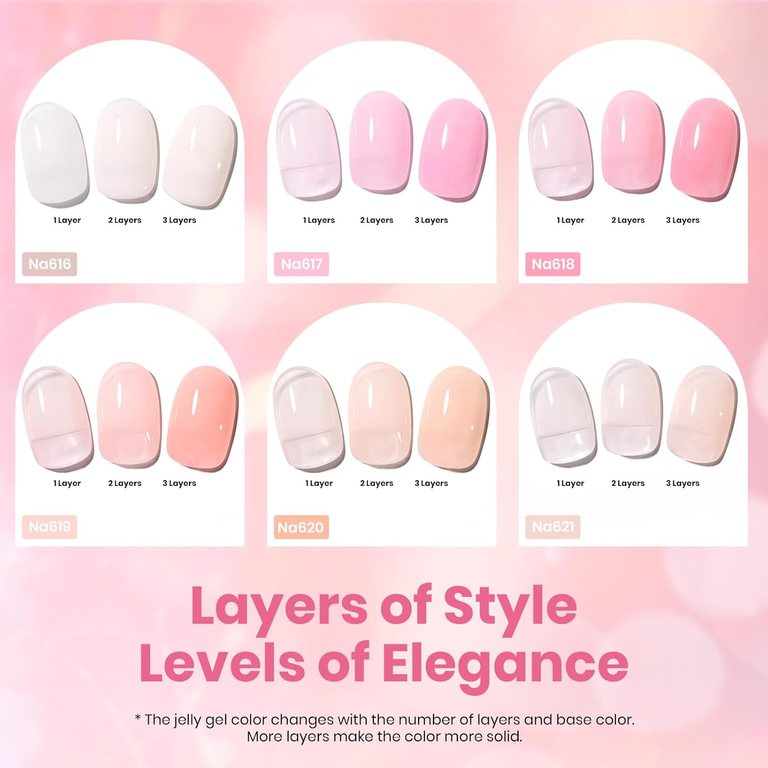 - 【What You Get】Beetle's Latest 6 Hema Free Bare Pink Shades Jelly Gel Nail Polish! Choose from 6 beautiful shades of pink, from nude to soft blush. Explore our range of nude shades, each one adding a touch of elegance and sophistication to any outfit. You can also use the nude color in it as the base color of light gel nail polish! Color Number: Na616-Na617-Na618-Na619-Na620-Na621