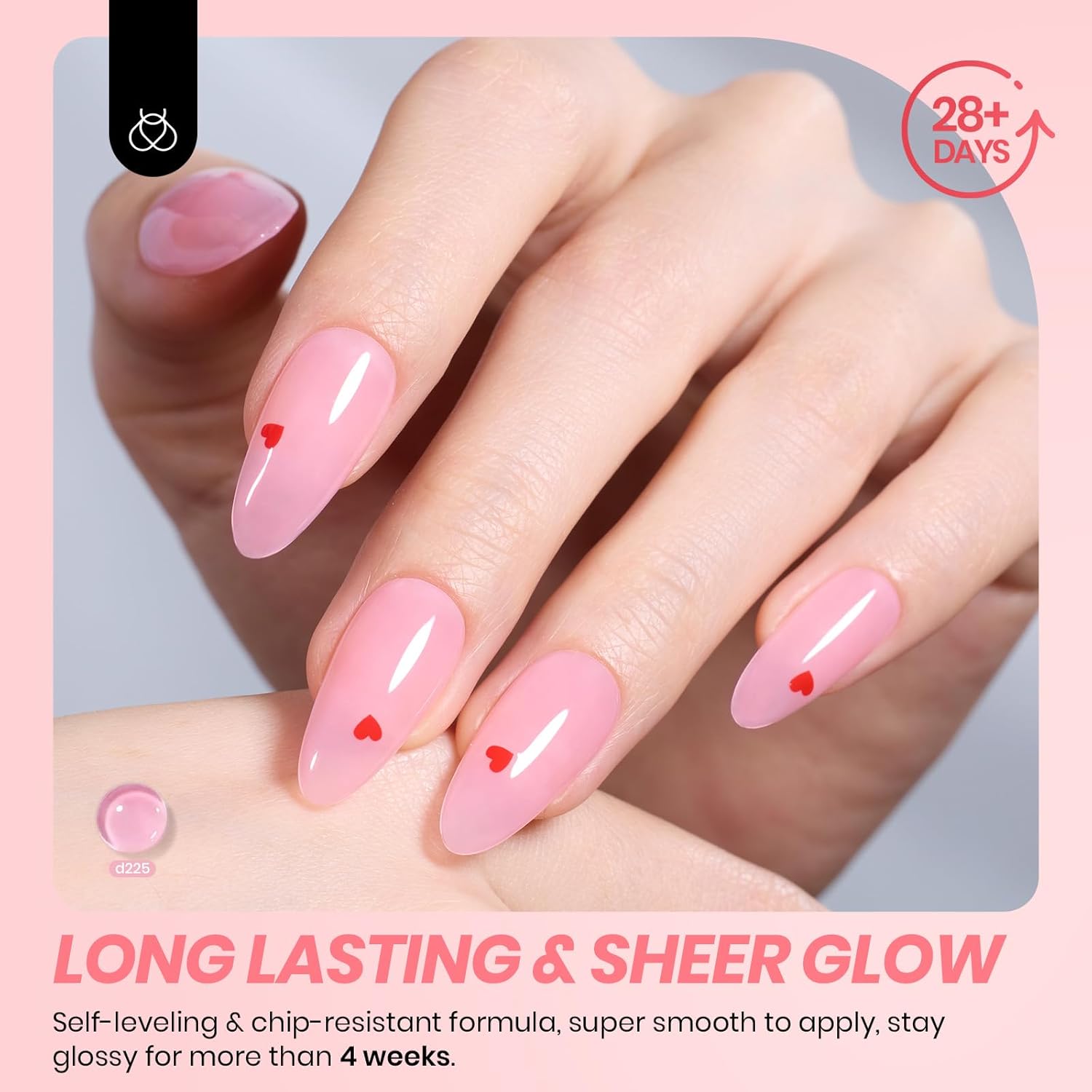 - 【Peach Color Sheer Gel 】Apply several layers to build up the color from clear translucent to solid opaque. Each layer, whether one, two, or three layers, creates a different effect. This peach nude pink color jelly gel nail kit is UV gel and need to be cured 60-120s. (Note: It must be used with a base coat and top coat, which are not included and need to be purchased separately)