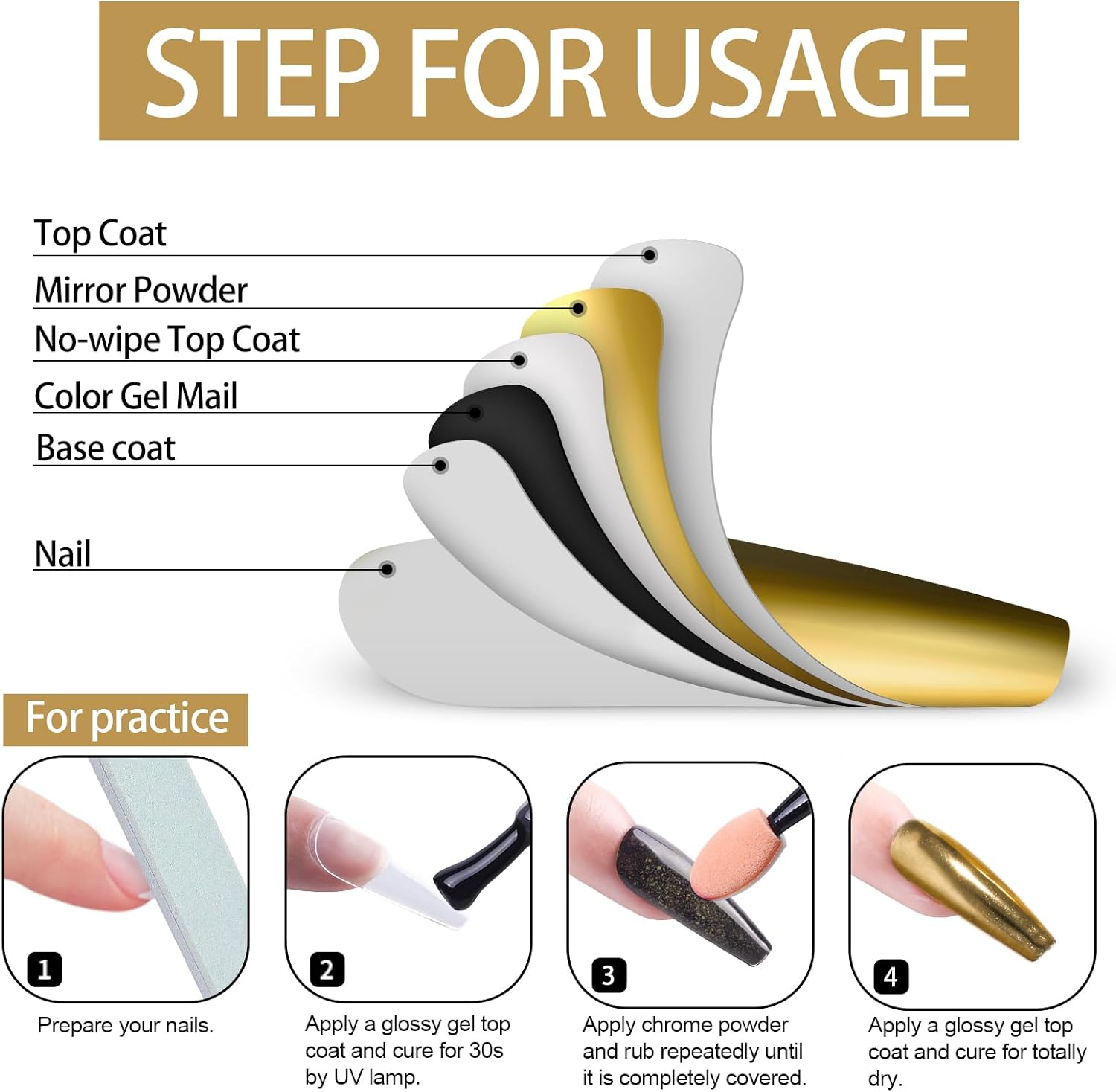 - 【The Scope Of Application】:All chrome powders should only be applied to glossy No wipe top coat to embellish Nail-Polishes color. Otherwise it is unusable, it can't be applied directly to the nail, and it can't be applied directly to the skin. Artdone chrome powder can be applied on UV gel nails, acrylic nails or false nail tips. You can use them very easily