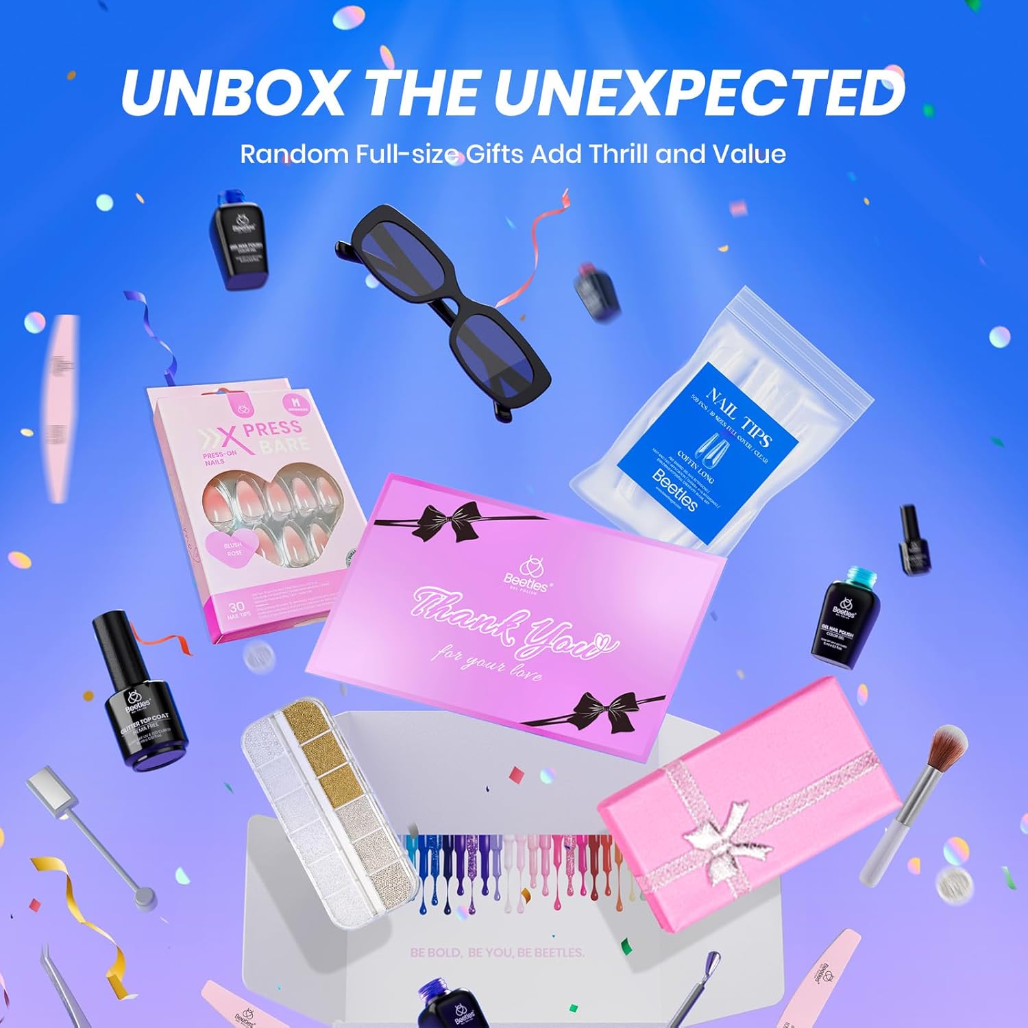 - 【Surprise Gift Box for You】 By purchasing this set, you will also receive Beetles limited time gift box, which includes sunglasses, false nail tips, nail decors, press on nails and so on. These gifts are not only practical, but also add more fun and possibilities to your nail art experience.Truly achieving "buy more" and getting better value for money.
