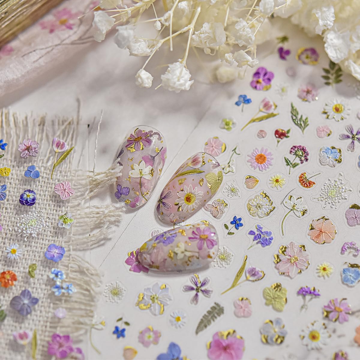 Flower Nail Stickers for Nail Art Floral Nail Decals with Gold Accent,Mini Flower Stickers for Nails Design 3D Self Adhesive Nail Supplies & Decorations for Women Girls,1 Sheet DIY Manicure Decor