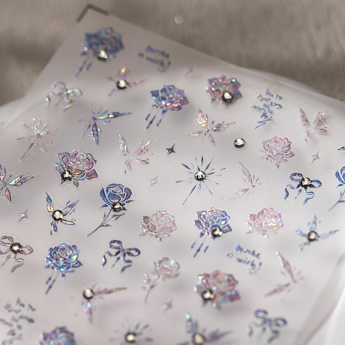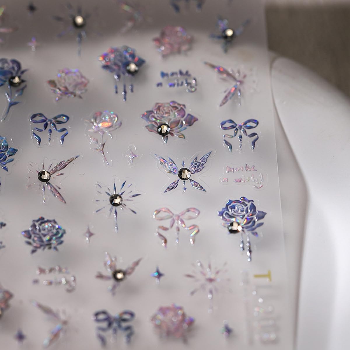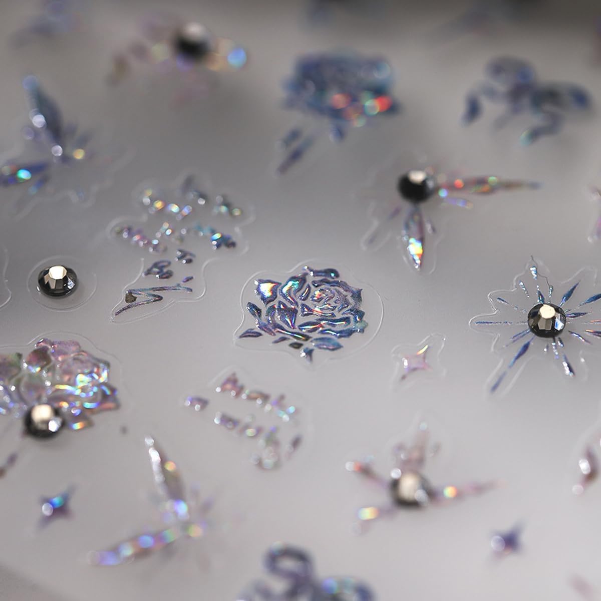 Rose Nail Stickers for Nail Art Holographic Flower Nail Decals with Rhinestone Spring Stickers for Nails Designs Self Adhesive Nail Art Supplies & Decorations for Women Girls 1 Sheet
